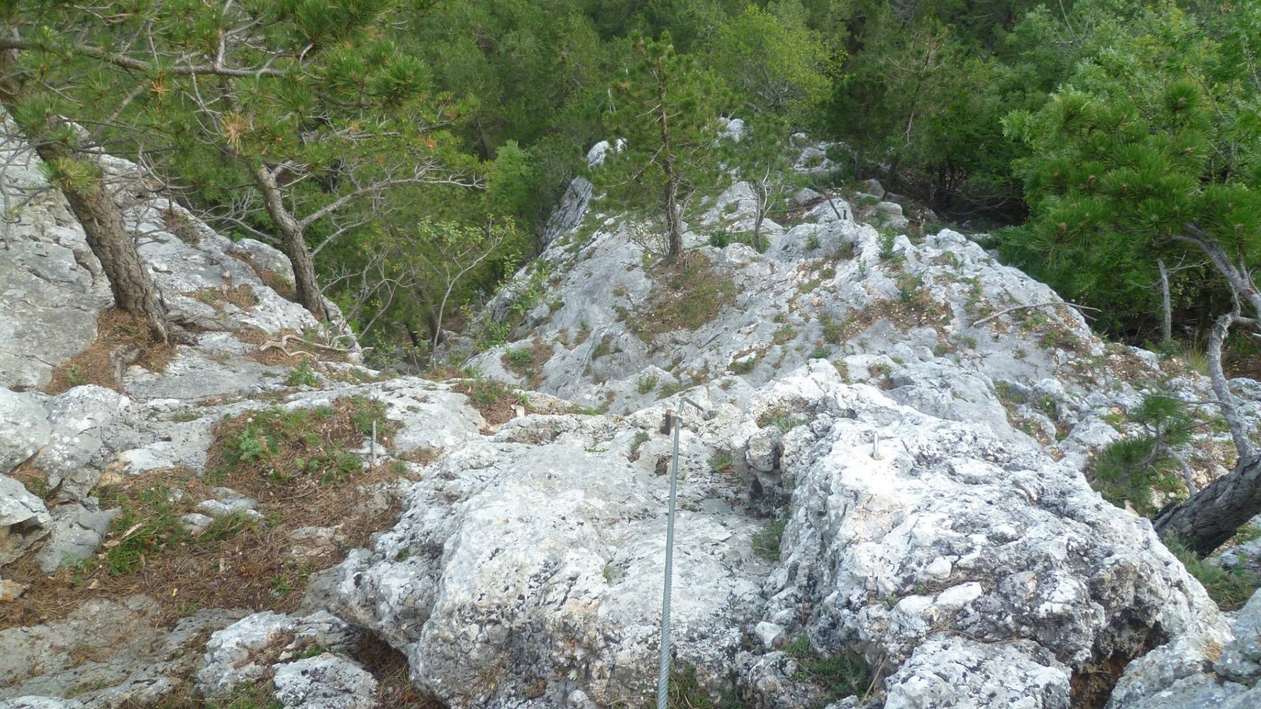 Für den neuen Einstieg verläßt man den Springlessteig bereits kurz vor dem Plateau und quer in einer Linkskurve, kurz nach einer Gedanktafel (Vater + Sohn) 10 m waagrecht nach rechts (Osten) bis zum Beginn der Versicherungen.