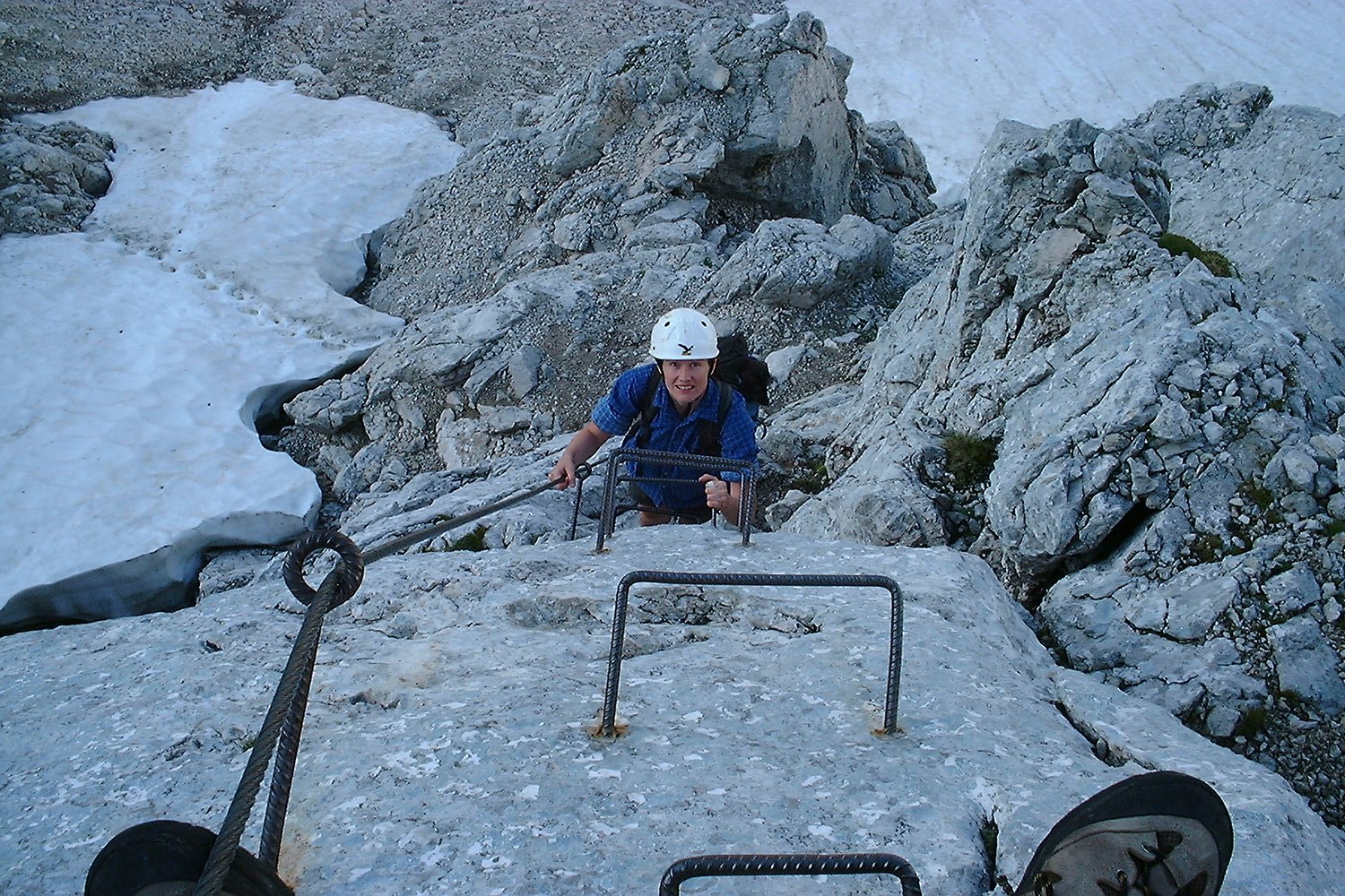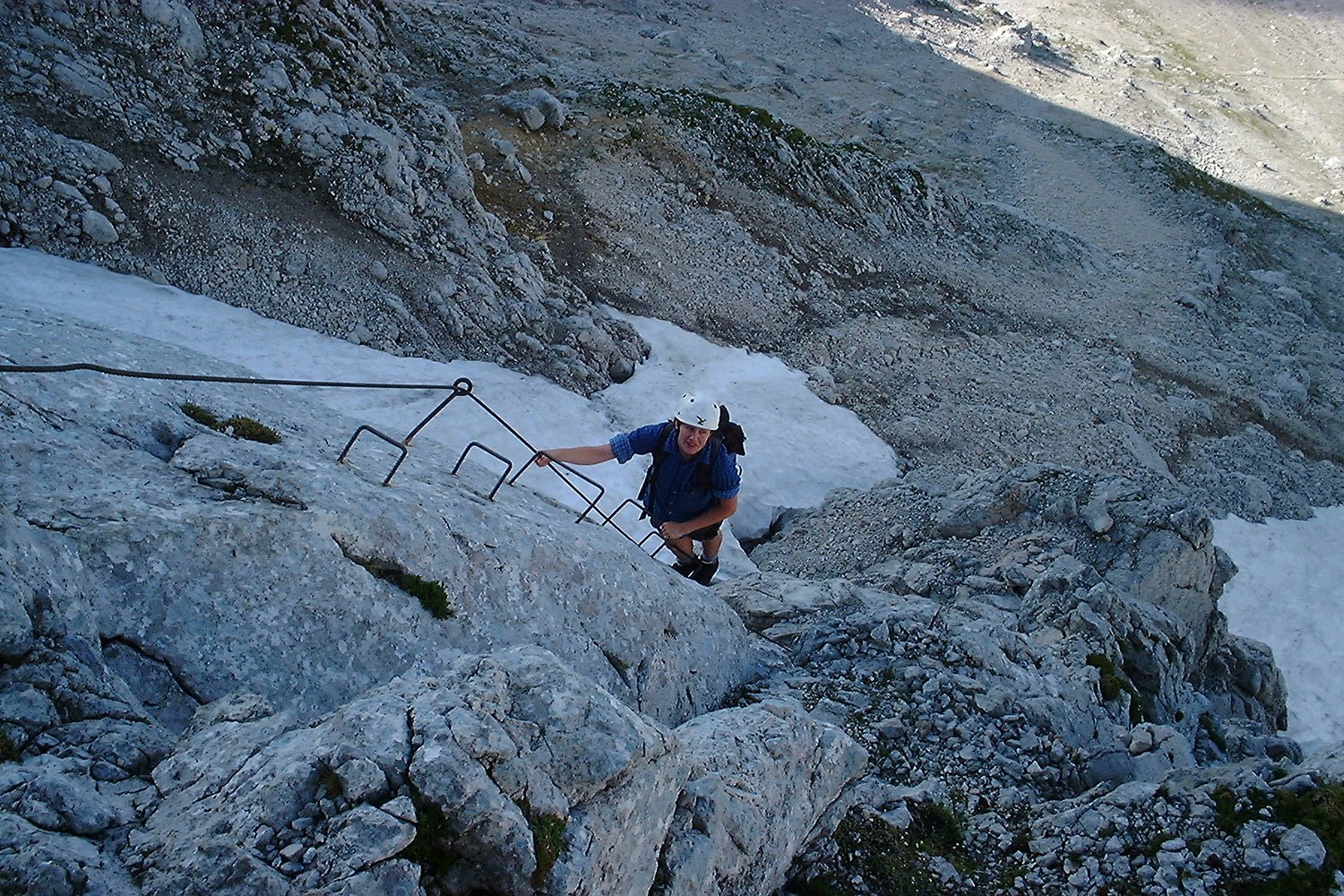 Kompl. Klettersteigausrüstung, Helm . Beim Zustieg im Frühjahr sollten die Altschneefelder nicht unterschätzt werden.