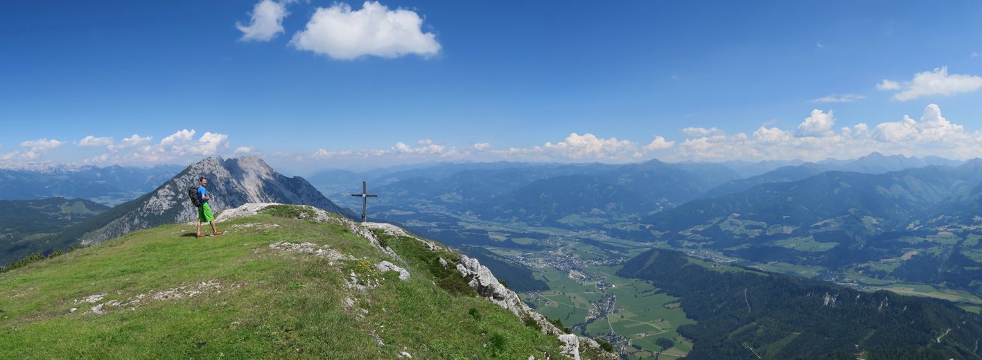 Vom Ausstieg nach links auf dem Wanderweg zurück zum Ghf. Steinerhaus und weiter zum Parkplatz. Alternativ kann man noch 15 Min. bis zum Gipfel des Stoderzinken aufsteigen (empfehlenswert, schöne Aussicht).
