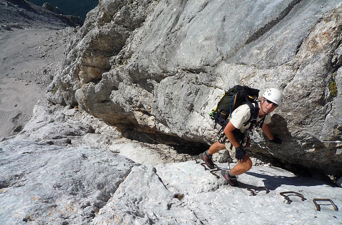 Dort, wo es steiler ist, gut mit Stahlseil und Klammern versichert. Es gibt aber auch viel nicht mit Seilen versichertes Schrofengelände!