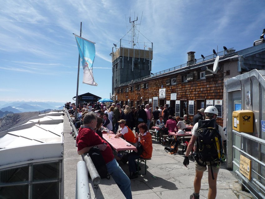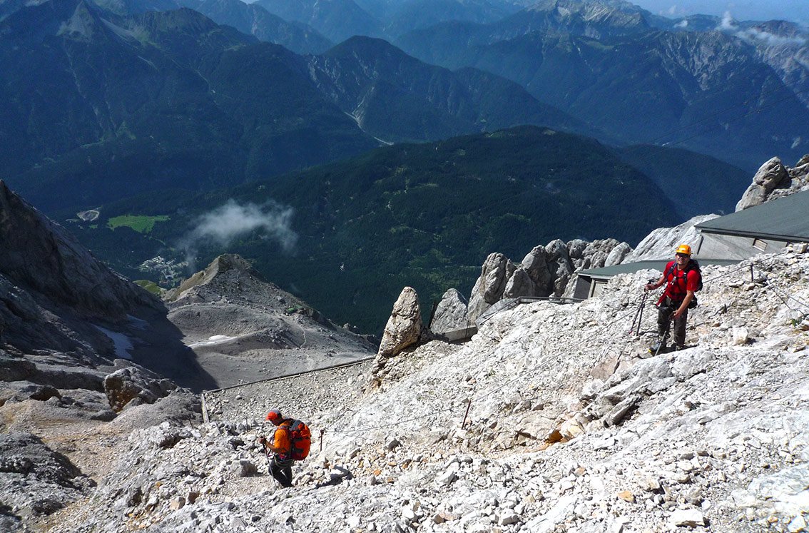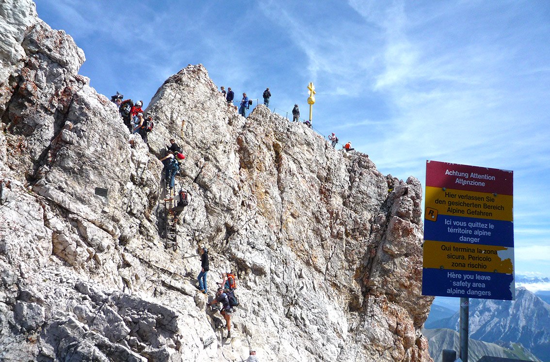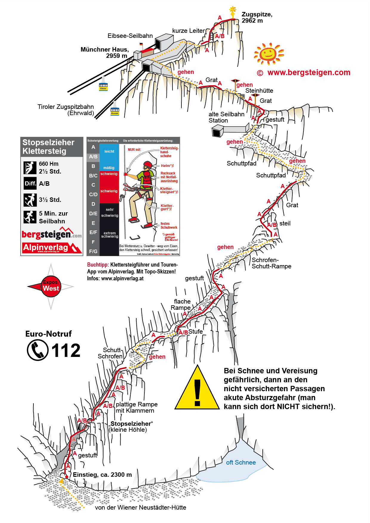 Vom Einstieg geht man kurz über Schrofen, dann gesichert (A) an einer schrägen, kaminartigen Rinne aufwärts. Man kommt zum sogenannten „Stopselzieher“ (A/B; kleine Durchgangshöhle). Nach der kleinen Höhle an einer schönen Plattenrampe (A/B und A) empor, bis die Sicherungen enden. Es folgt Gehgelände (immer den Markierungen folgen; kurze Stelle A). Nach einer kurzen Stufe (A/B) steigt man auf einer flachen Rampe (A) nach rechts aufwärts, oben über eine Rinne. Erneut erreicht man Gehgelände (Markierung beachten!), dieses führt zu einer gestuften, gratartigen Rippe (kurz A/B, danach A). Dort, wo das Stahlseil aufhört, beginnt ein Schuttpfad, welcher zur alten Seilbahnstation leitet. Rechts der alten Bergstation kurz über steile Schrofen (A) aufwärts und man steht oben auf dem Grat (A). Dort nach links, vorbei an einer kleinen Steinhütte, dem breiten, gestuften und oft mit etwas Schutt bedeckten Grat folgen (kurz A, meist gehen). Man kommt zur Bergstation der beiden Seilbahnen (Eibsee und Ehrwald) und dem Münchner Haus. Am östlichen Rand der pompösen Bergstation führt ein nicht ausgesetzter Mini-Klettersteig (kurz A/B, meist aber A und leichter) auf den höchsten Punkt von Deutschland (2962 m) mit dem berühmten goldenen Gipfelkreuz, man steht die letzten Meter aber oft im Stau.