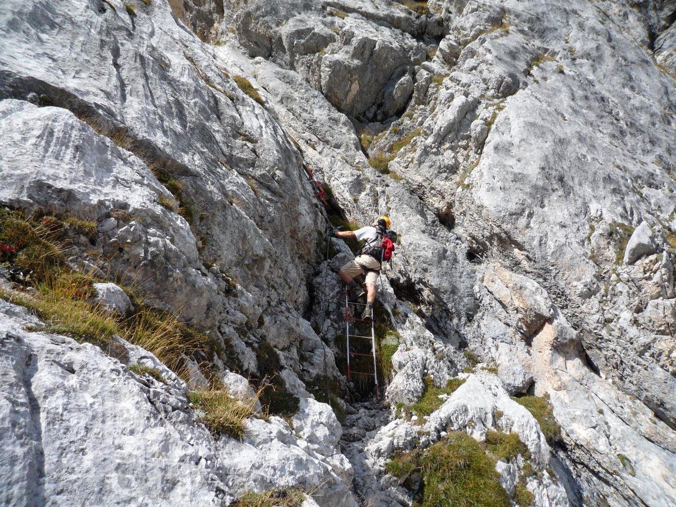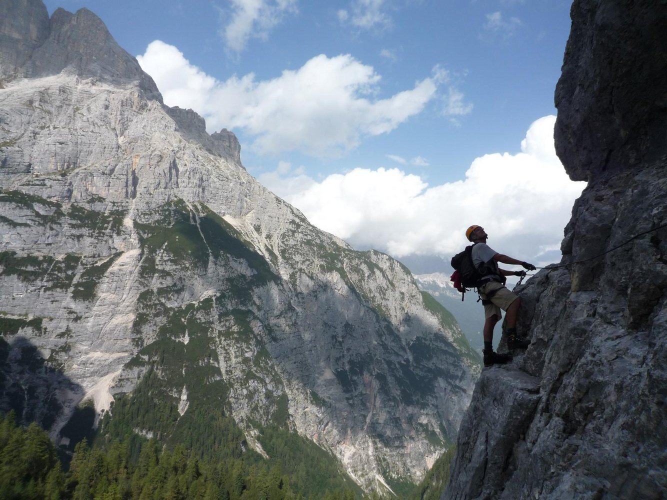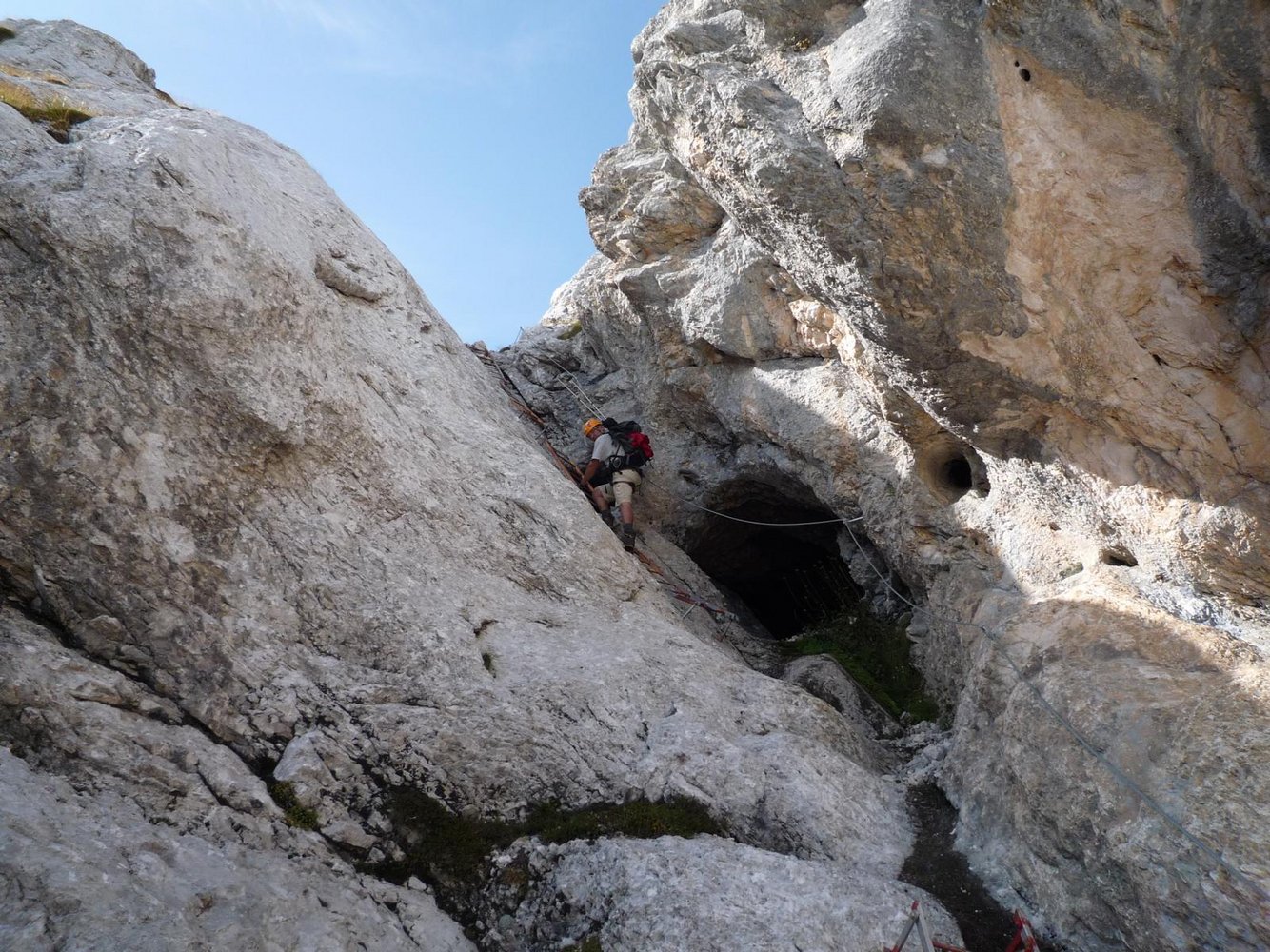 Die Versicherungen leiten durch eine steile Rinne (B) auf ein Grasband, dem man zu einem Felsaufschwung folgt, der gut versichert (B) zur Forc. di Mescol, 2370 m führt. Auf der Westseite über Wiesenhänge zu einer kurzen erdigen Rinne absteigen, durch diese versichert (A) in den großen, mit Blöcken übersäten Kessel der Meduce di Dentro hinab. Am linken Rand der Blöcke (nicht leicht zu fi nden) entlang zu den Osthängen der Croda Rotta, durch die eine markante Schuttrinne zieht, die in halber Höhe durch eine mit 9 Leitern bestückte Felsstufe unterbrochen wird (A/B). Nach der Leiternpassage gelangt man im oberen Teil der Rinne hinauf zur Forc. Croda Rotta, 2590 m. Auf der Westseite NICHT absteigen, sondern nach links (kurz versichert A) in eine kleine Scharte mit Felsturm queren. Dann über anfangs steiles Geröll hinab und linkshaltend zu einem Rücken, den man bis zu einem markanten Felsblock weiter absteigt. Dort leiten Versicherungen steil (B) in die Enge Scharte der Forc. d. Vanedel, 2372 m. Auf der anderen Seite der Scharte warten eine kurze Leiter (B) und Versicherungen (B), die auf einen Plattenrücken führen. Danach leichte Kletterei (max 1) und Versicherungen (bis B), bis man auf dem Rücken links der Schlucht auf den Wiesenboden absteigt. Es folgt eine Linksquerung zu einem Felseck, welches man luftig aber leicht (A/B) überwindet. Zu Fuß weiter zum Talboden des Val Grande queren – oben am Hang ist klein das Biv. Voltolina zu erkennen. Der Weg 280 folgt nicht dem Talboden – dort ist über den Weg Nr. 278 ein Schnellabstieg ins Val di San Vito möglich (kurz versichert, B; Vorsicht bei Nässe!) – sondern steigt sanft auf der anderen Talseite zum markanten Cengia del Doge auf. Das immer enger werdende Schuttband führt zu einem exponierten Eck, wo Versicherungen über die steilsten, erdigen Stellen helfen (A, Trittsicherheit!). Danach wird das Band wieder breiter und es geht gemütlich zur Wegkreuzung mit dem Weg 226 ins Val di San Vito.