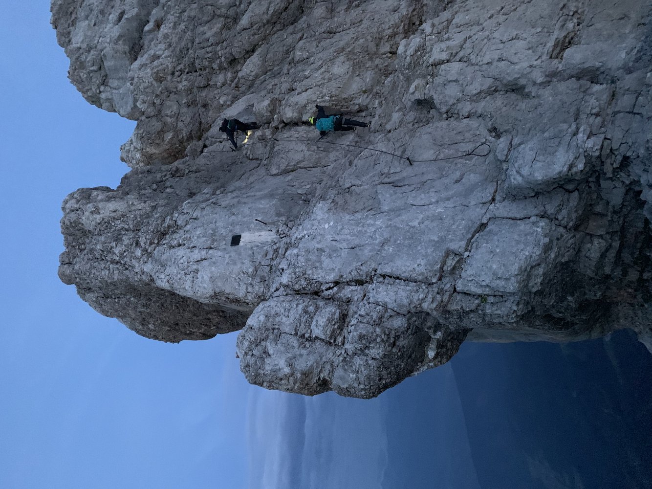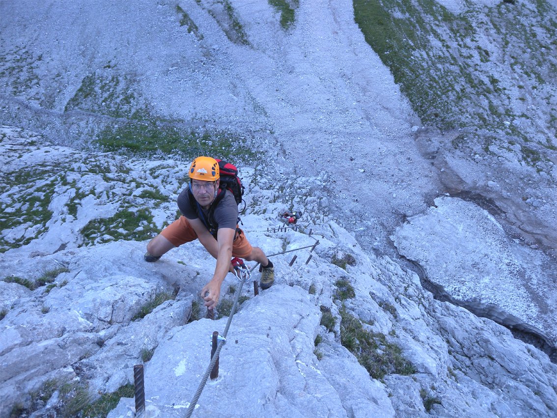 1. Notabstieg nach Anna Klettersteig: In der Scharte rechts den roten Punkten (versichert A/B) hinunter zur Südwandhütte folgen, ca. 40 min.