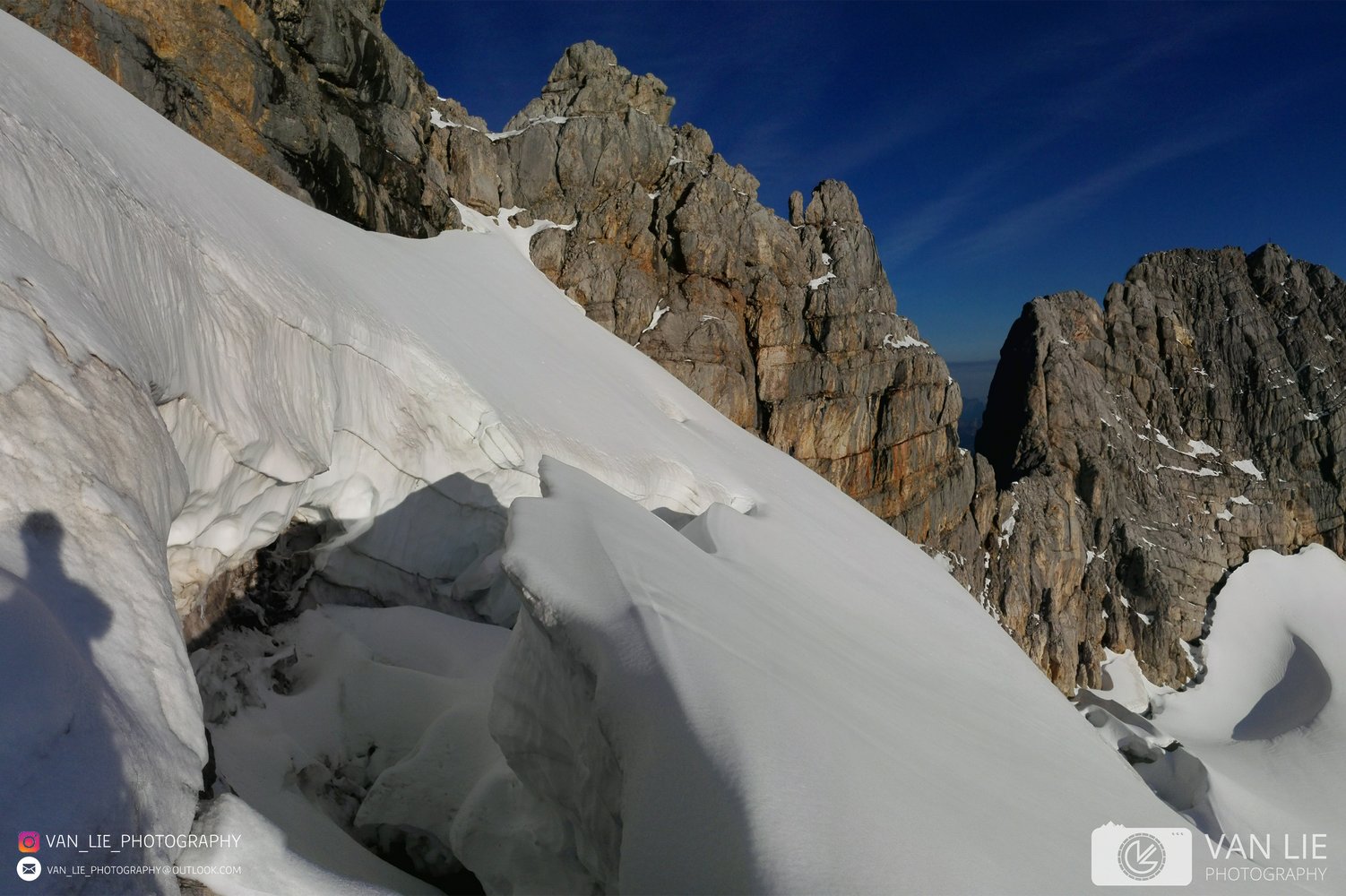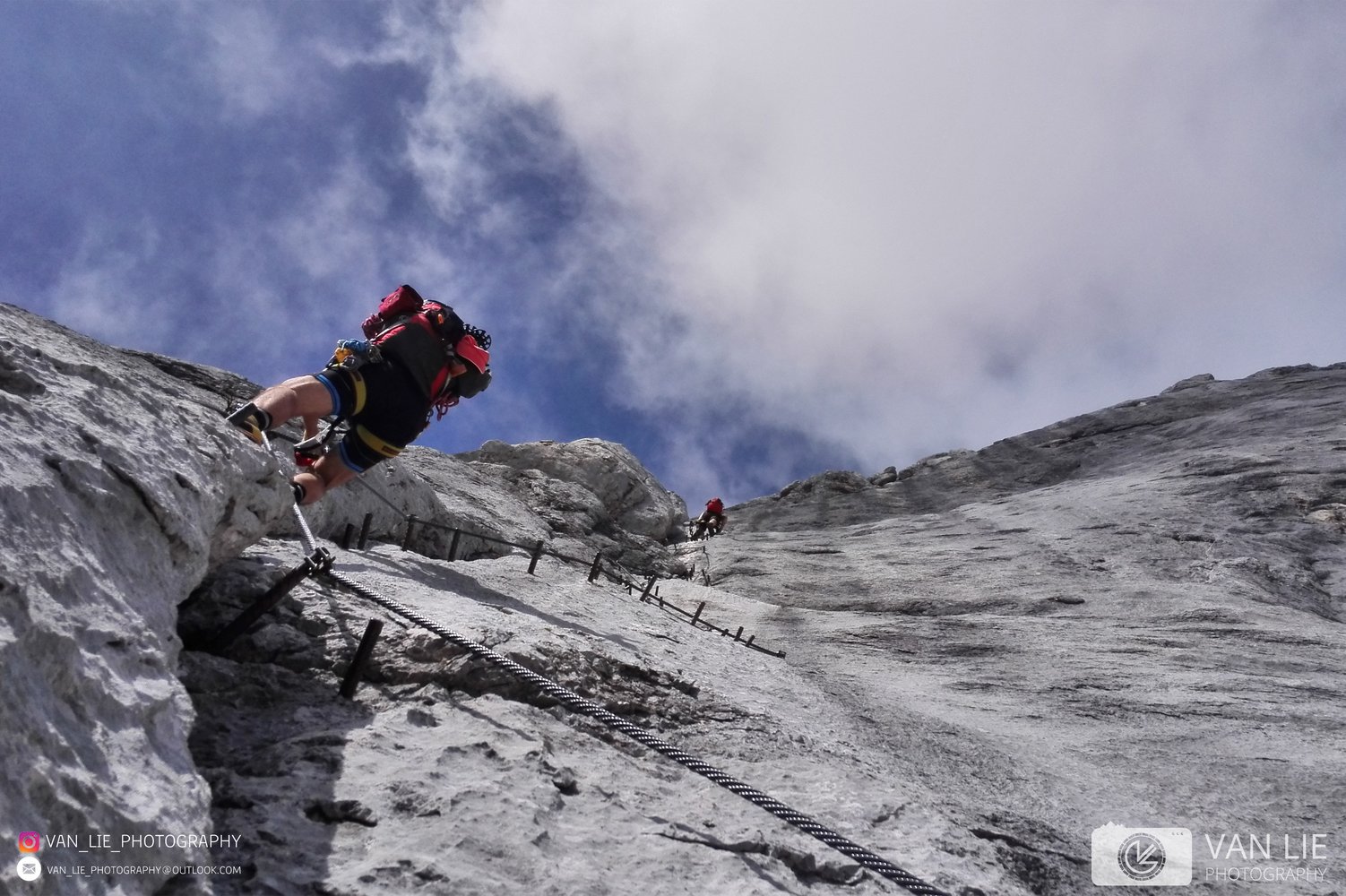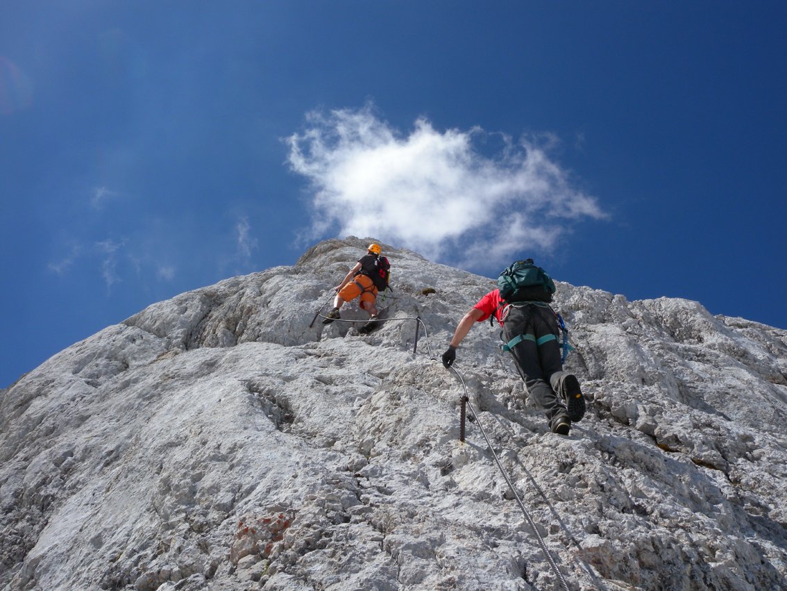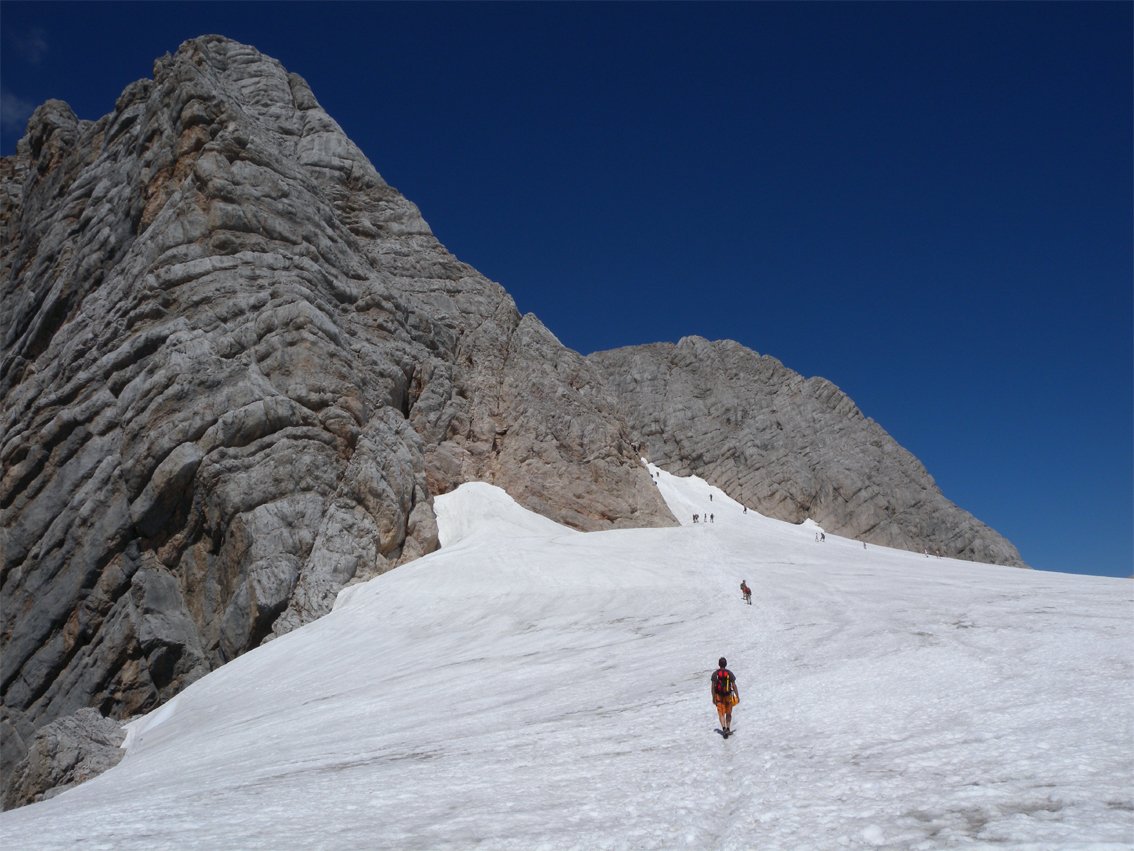 Auf dem Weg zum Johann-Klettersteig Einstieg sind oft steile Altschneefelder (wenn diese gefroren sind, braucht man Steigeisen und Pickel). Ganz oben, kurz vor dem Gipfel, oft Menschenmassen auf dem Steig, daher sind dort meist Wartezeiten einzukalkulieren!