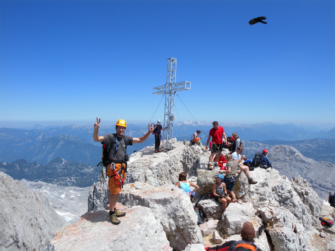 Teil 3: Von der Seethalerhütte geht es weiter über den Gletscher zum Einstieg des Schulteranstieges. Über diesen Klettersteig (Stelle C, sonst leichter) erreicht man dann nach ca. 300 Hm den Dachsteingipfel (2995 m) und gleichzeitig den höchsten Punkt der Steiermark.