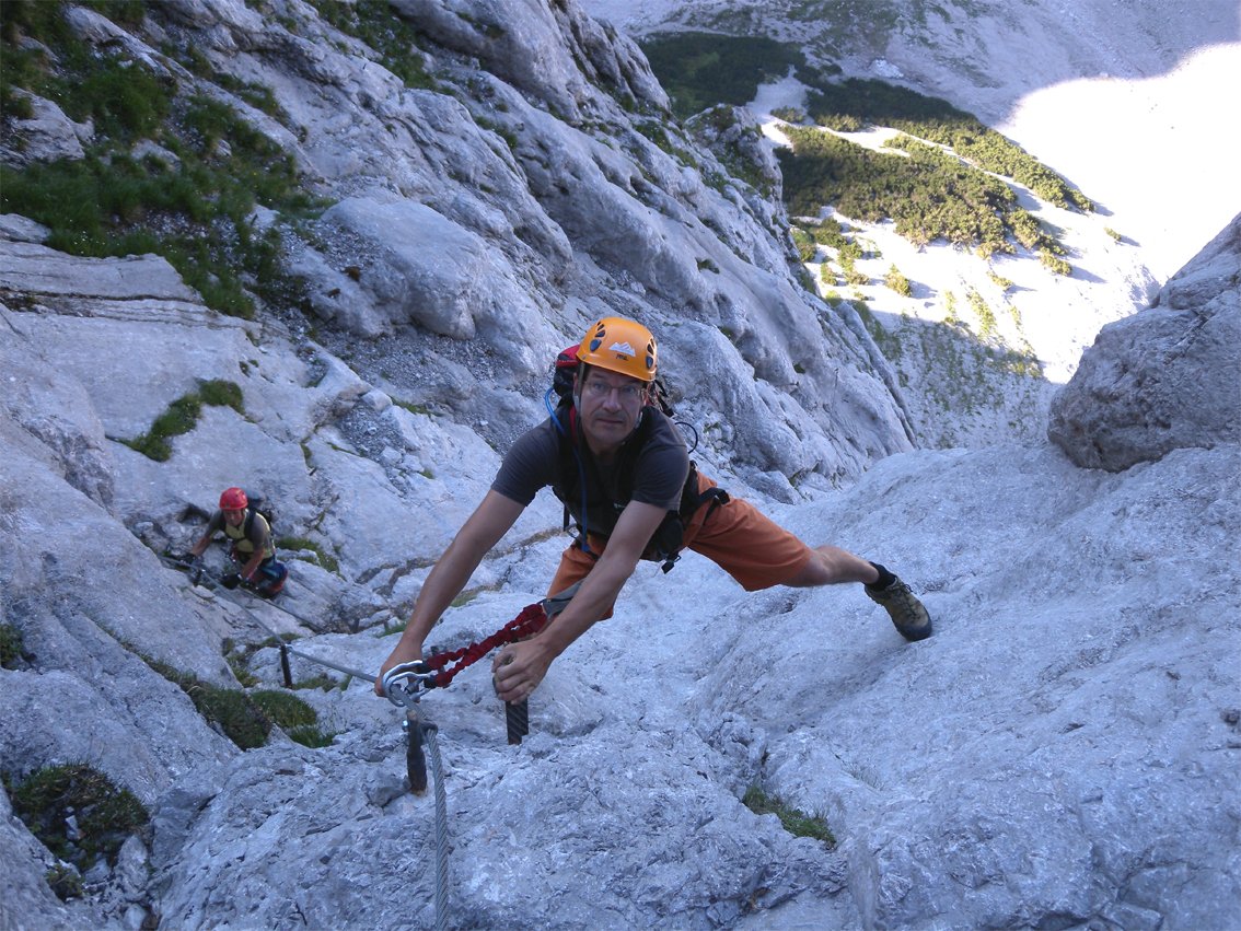 Kompl. Klettersteigausrüstung, Helm (siehe oben!). Beim Zustieg im Frühjahr sollten die Altschneefelder nicht unterschätzt werden (Leichtsteigeisen u. Pickel).