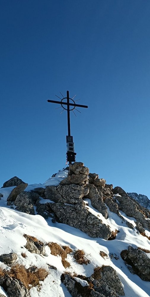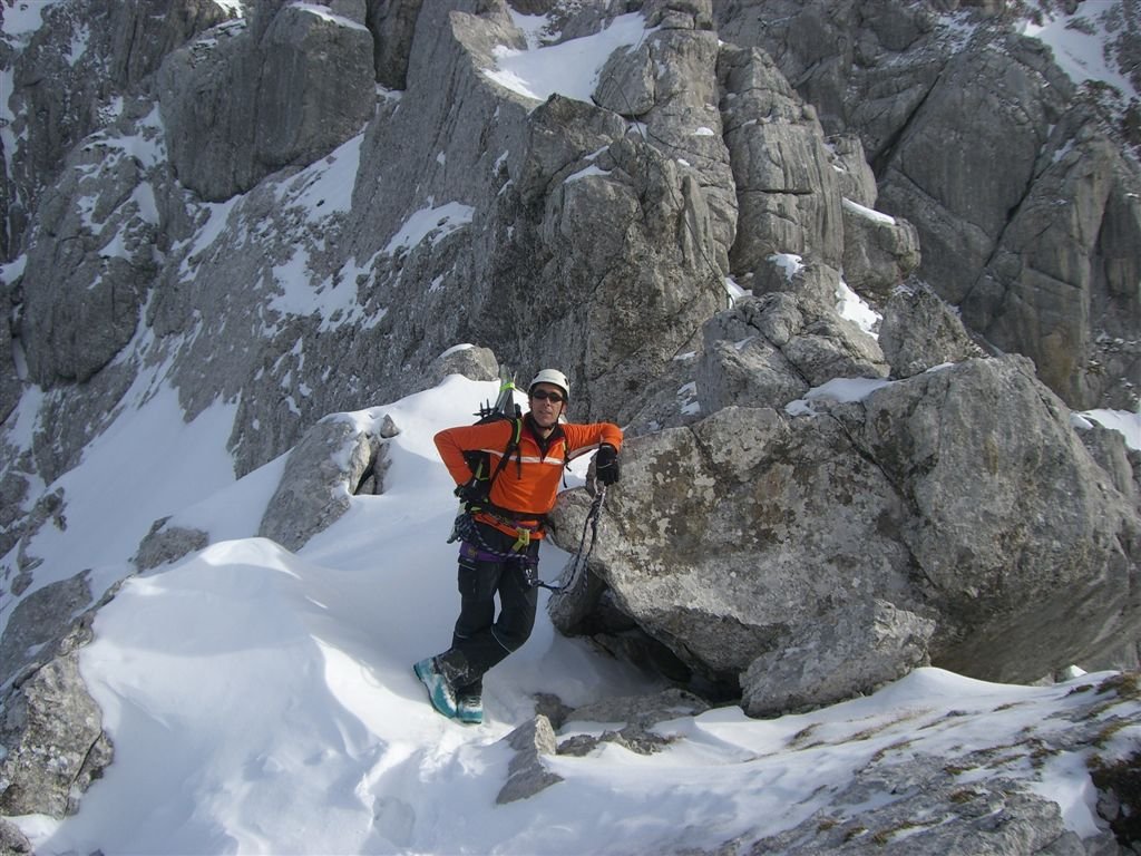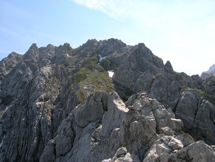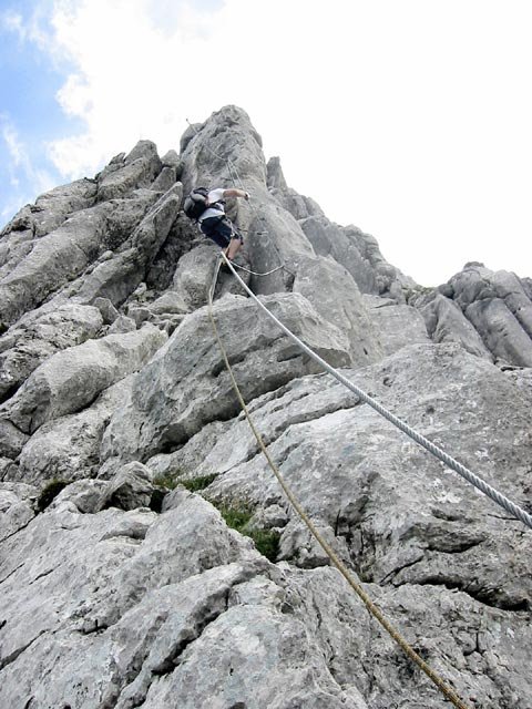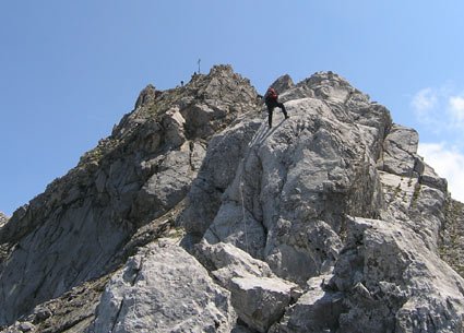 Teil 2: Dieser hat nach einer Querung (B) im unteren Teil ein Steilstück (C/D, aber hier macht sich bei den meisten Begehern schon das Konditions- und Kraftproblem bemerkbar). Danach folgen wieder leichtere Passagen (A/B bis B), die mit kurzen Aufschwüngen (B/C) wechseln. Nach einem kurzen Gehstück kommt das letzte Gratstück vor dem Gipfel, auch hier kurze Steilpassagen (B, aber etwas leichter als unten), kurz vor dem Gipfel trifft man auf den Abstiegsweg, diesen folgt man zum höchsten Punkt mit dem Kreuz.