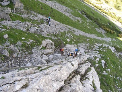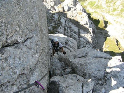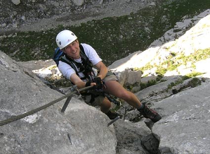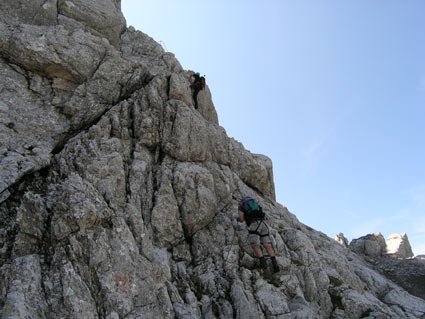 Kompl. Klettersteigausrüstung und Helm; für schwächere Geher ein kurzes Sicherungsseil. G enug zu Trinken.