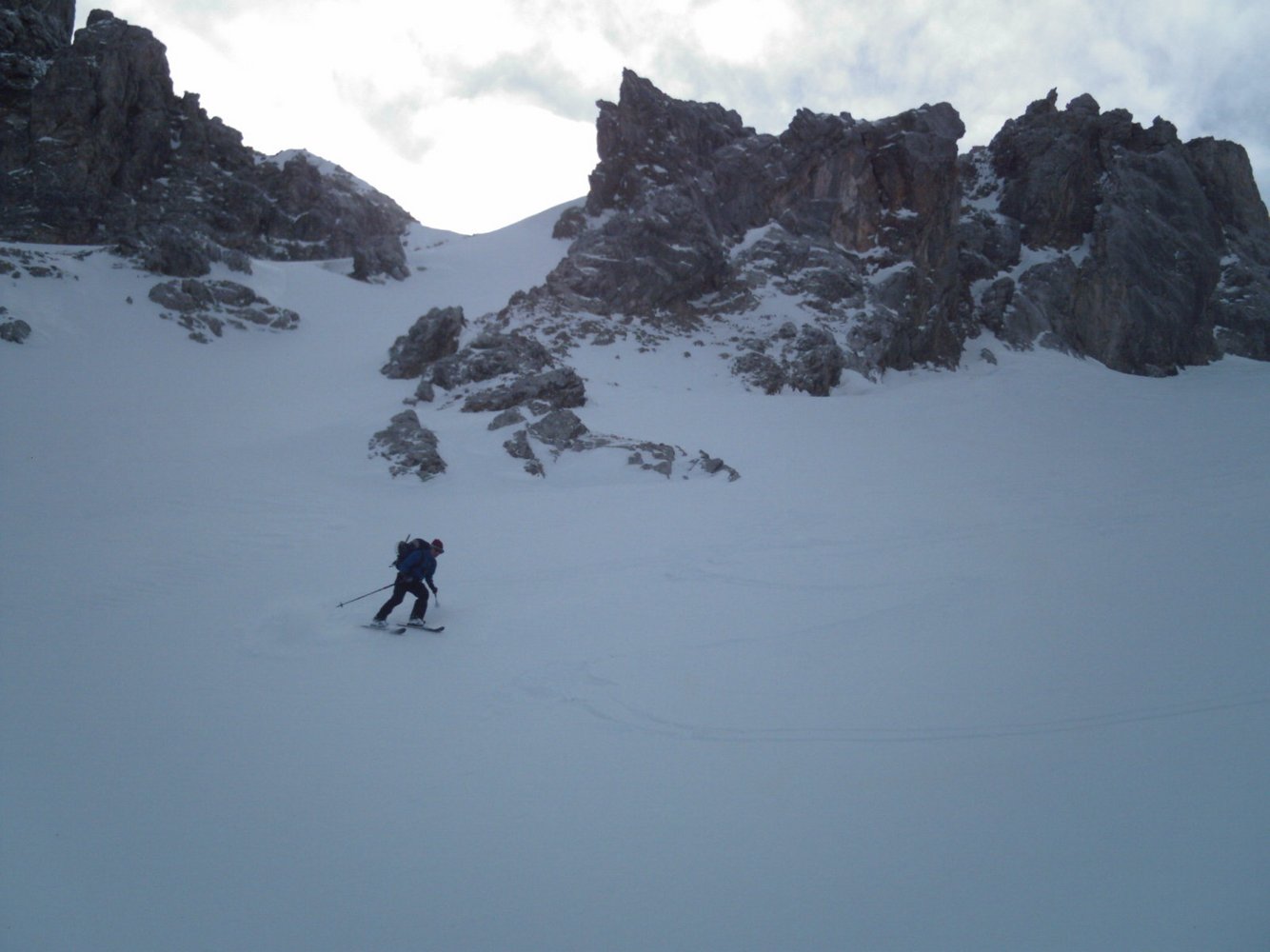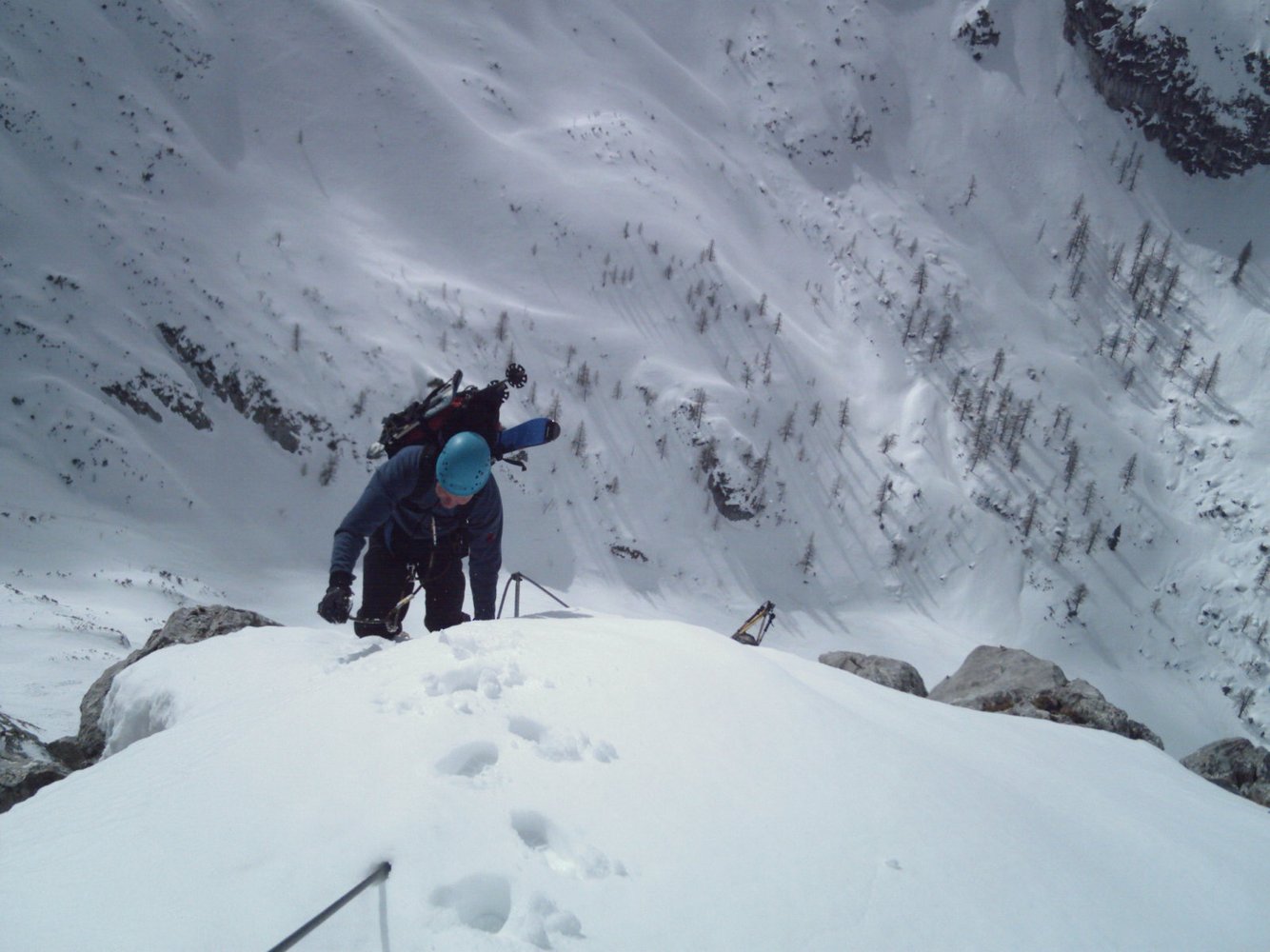 Gehpassage: Man folgt kurz den Steigspuren (teilw. rote Markierung) zum zweiten Aufschwung. Meist wird in diesem Bereich ausgiebig gerastet.