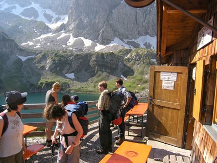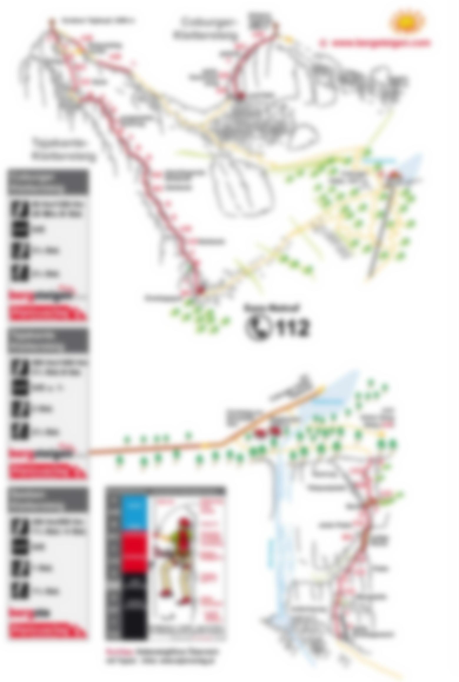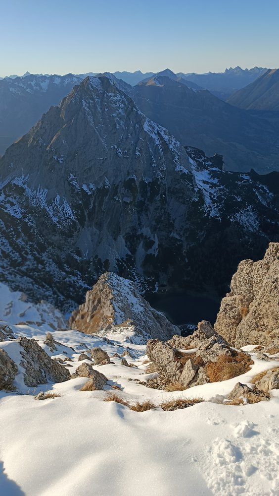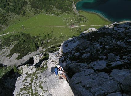Vom Gipfel zuerst nordöstlich über steiles Gelände (teilweise versichert, A/B) bis auf einen Schuttgrat absteigen, dann den Steigspuren weiter - teilweise felsdurchsetztes Gelände (auch einige Sicherungen) - bis auf Almwiese folgen. Nun den Weg weiter hinunter zum Drachensee und zur daneben liegenden Coburger Hütte aufsteigen. Von der Coburger Hütte zurück ins Tal.