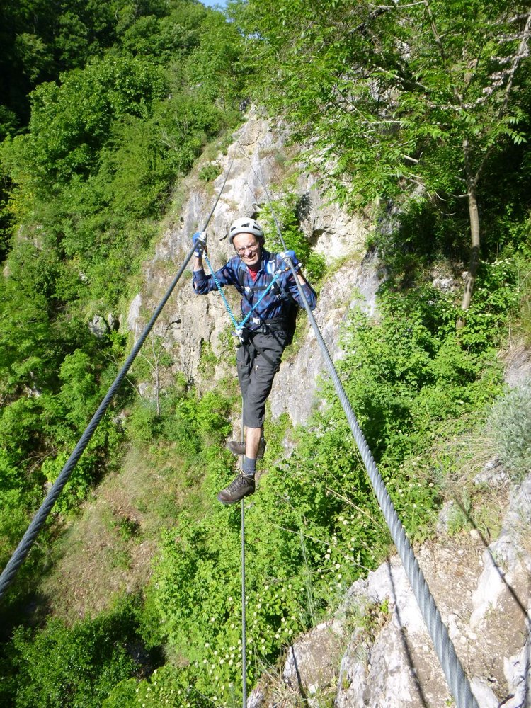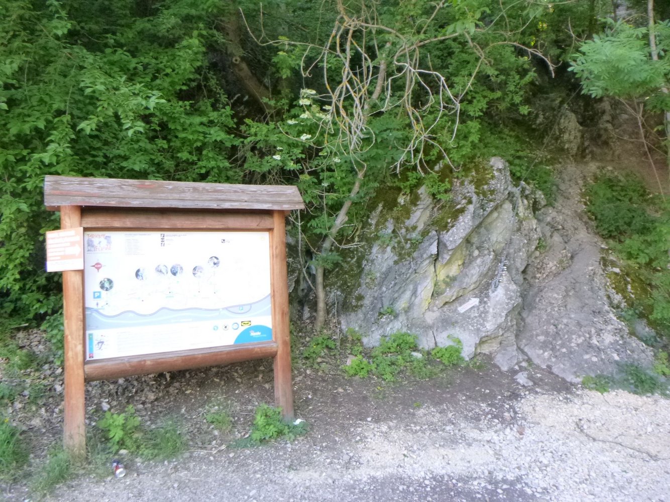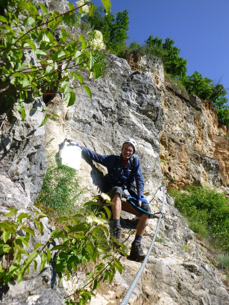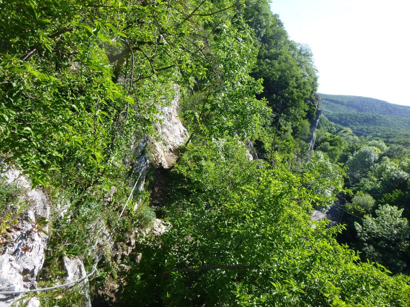Rechts von der Klettersteig-Tafel beginnt das ein Stahlseil und Waldpfad, der in 2 min. zum Anfang des 14 mm dicken Stahlseils mit dem Schild „Kö-Közi Nagy Traverz“ führt. Insofern kann man bereits am Parkplatz seine Klettersteigausrüstung anlegen.