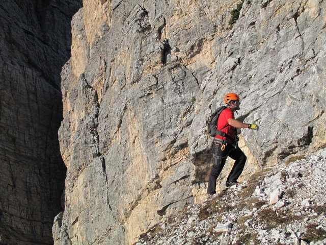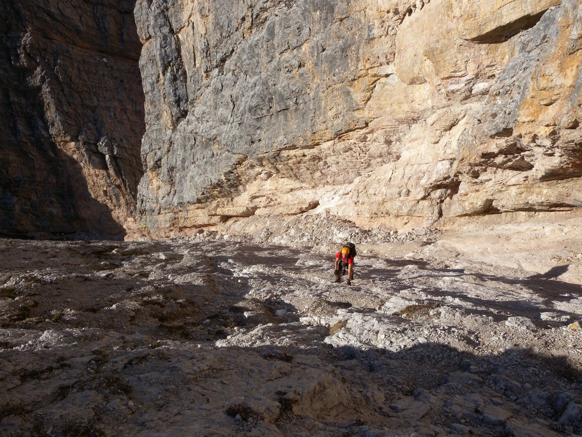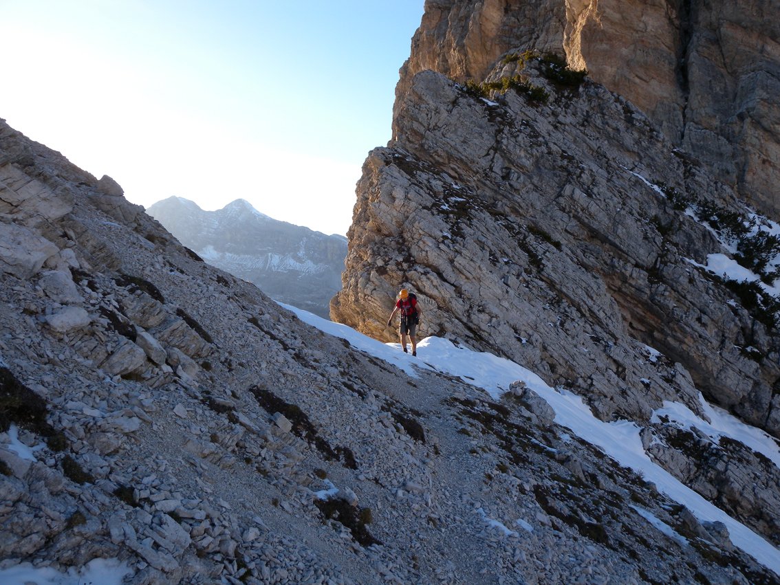 Links neben dem Spital auf der Wiese hinauf bis man auf den Wanderweg trifft. Auf diesem dann nach rechts aufsteigen bis dieser flach nach links verläuft. Bei einem Flachstück (Felsblock und Bank) zweigt links der Weg zum "Terza Cengia" ab. Man gelangt nach einer Latschenzone in ein Schuttfeld, wo von rechts ein Weg hinzu kommt (Wegweiser). Man steigt das Schuttfeld gerade bis zu den Felsen hinauf, quert dann rechts zum rampenartigen Band (Einstieg).