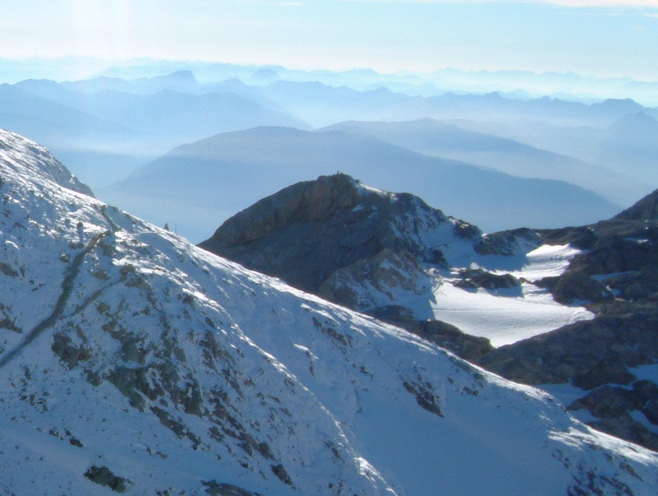 Nun entweder links über den Gletscher zum Beginn der weiteren Versicherungen, die zum Gipfel des Hochseilers (Mooshammersteig, B-C und Kletterstellen im 2ten Grad) führen.