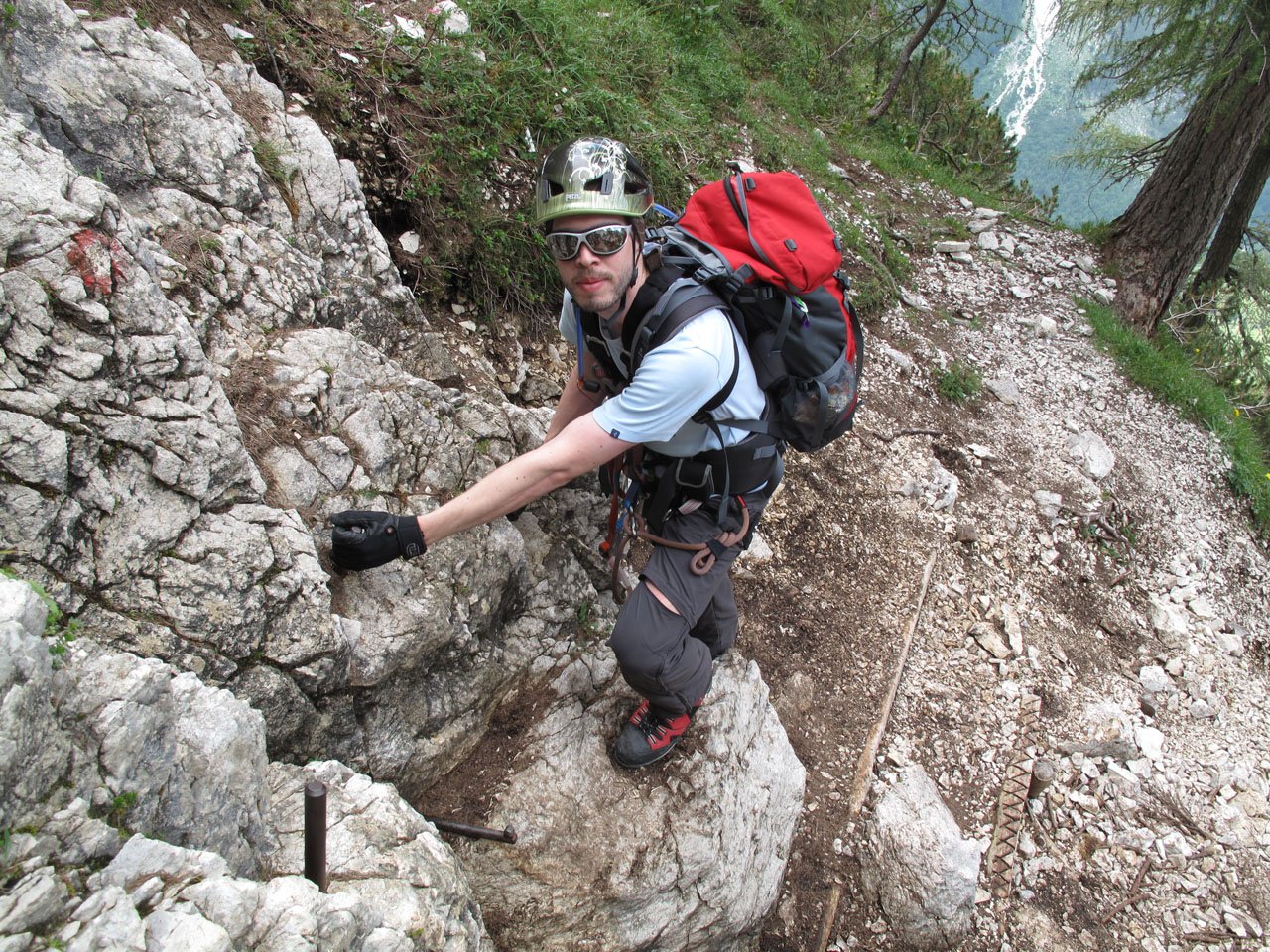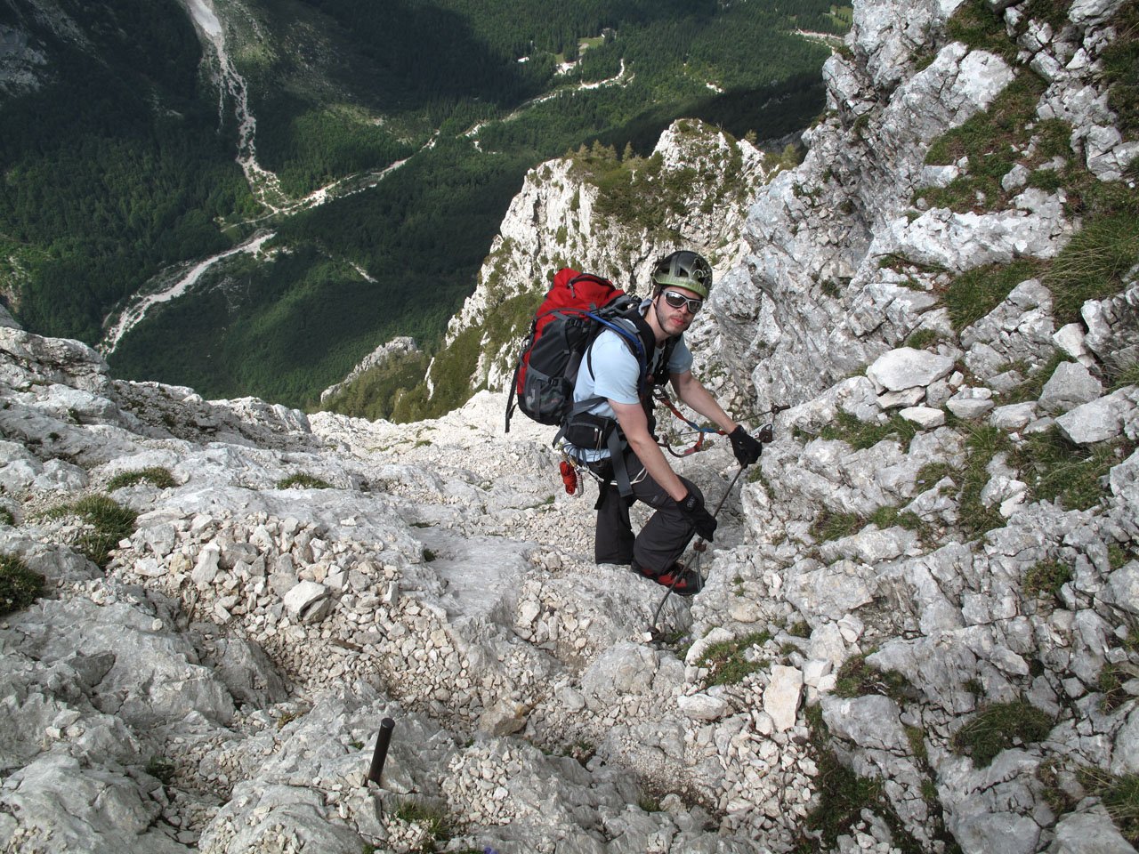 Vom Parkplatz durch das Vratatal an der Hütte Aljažev dom vorbei bis zu einem markanten Denkmal in Form eines großen Karabiners. Dort links abbiegen und durch das (meistens) trockene Bachbett. Im Wald immer steiler zu den ersten Versicherungen aufsteigen.
