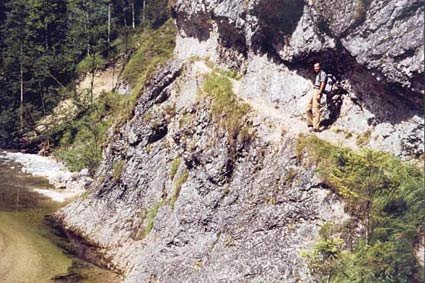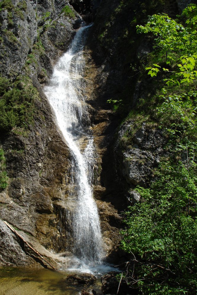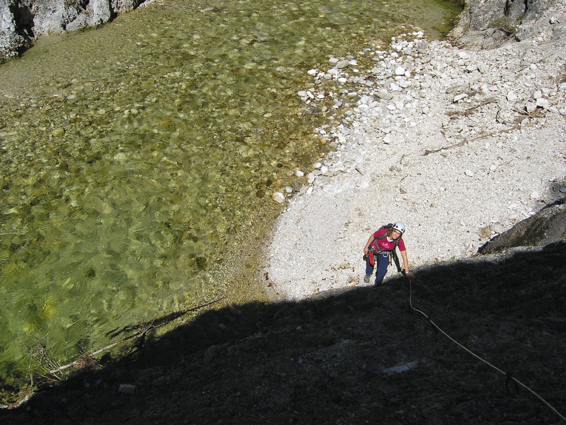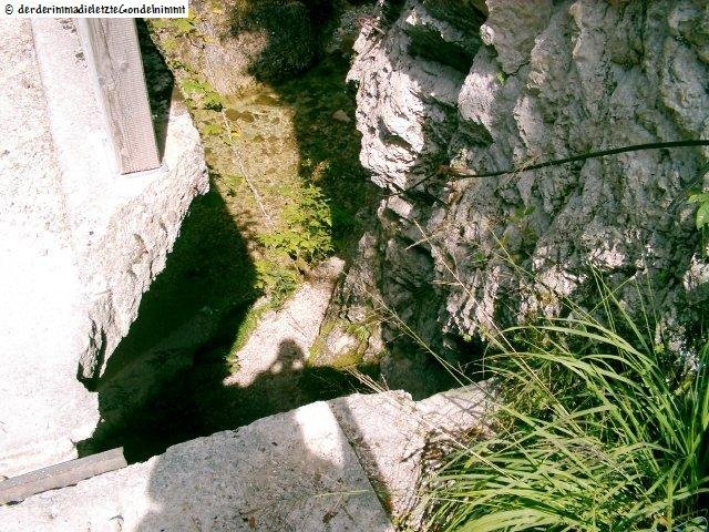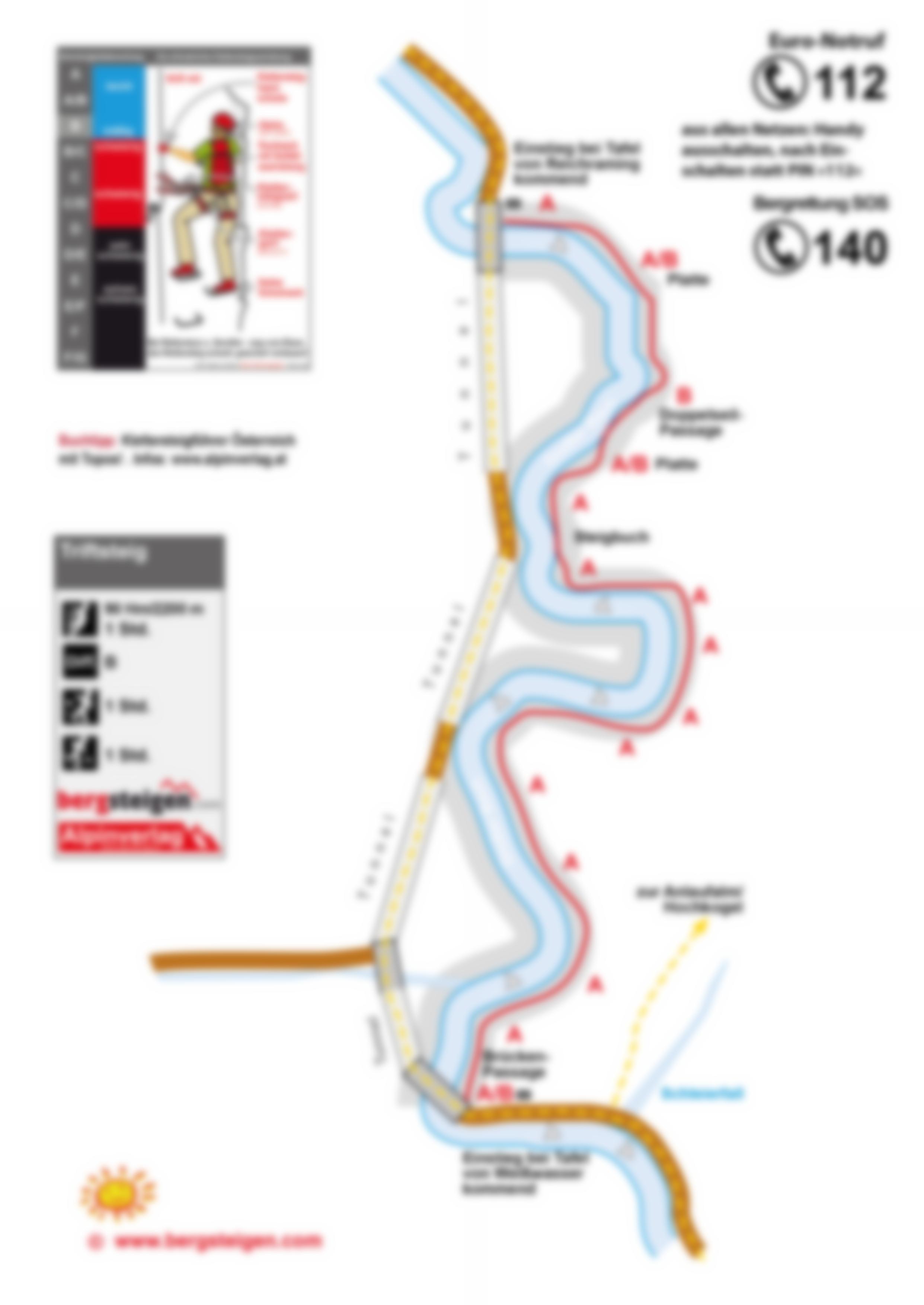 Siehe Topo-Skizze. Der Steig folgt immer dem Bach und ist an den ausgesetzten Stellen (meist A) gut abgesichert. Die schweren Stellen sind die Platte (A/B) und eine mit einem Doppelseil abgesicherte Steilstufe (B).