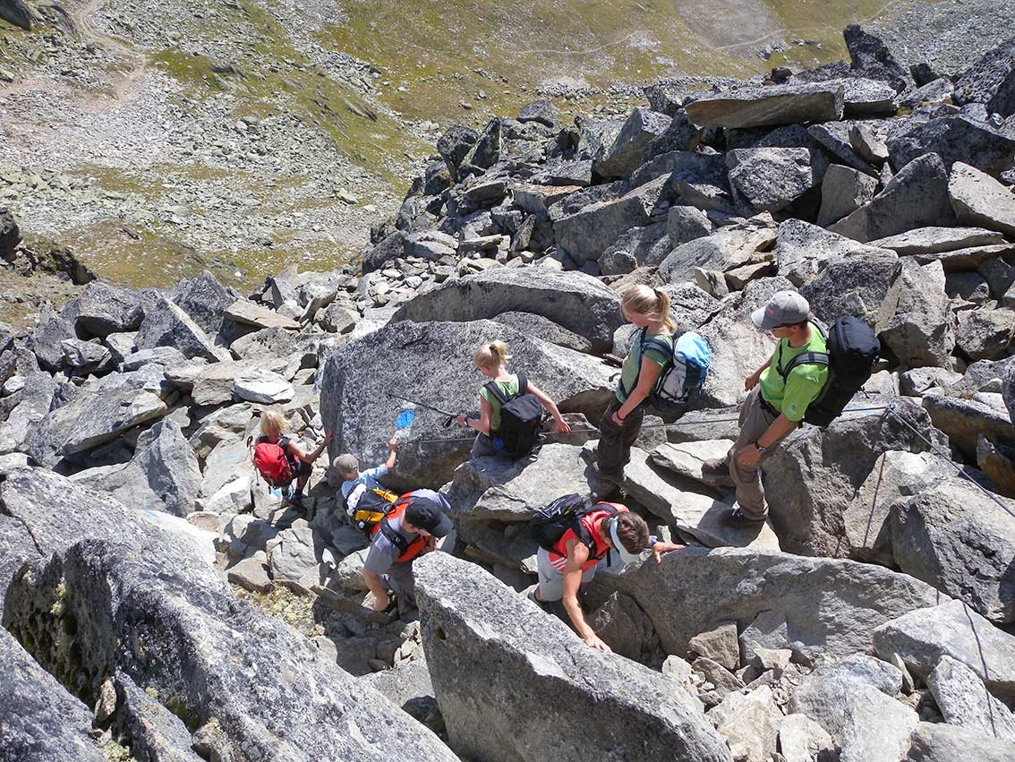 Nur für Kinder und Anfänger ein Klettersteigset - die Tour hat eher den Charakter eines schwarzen Bergweges.