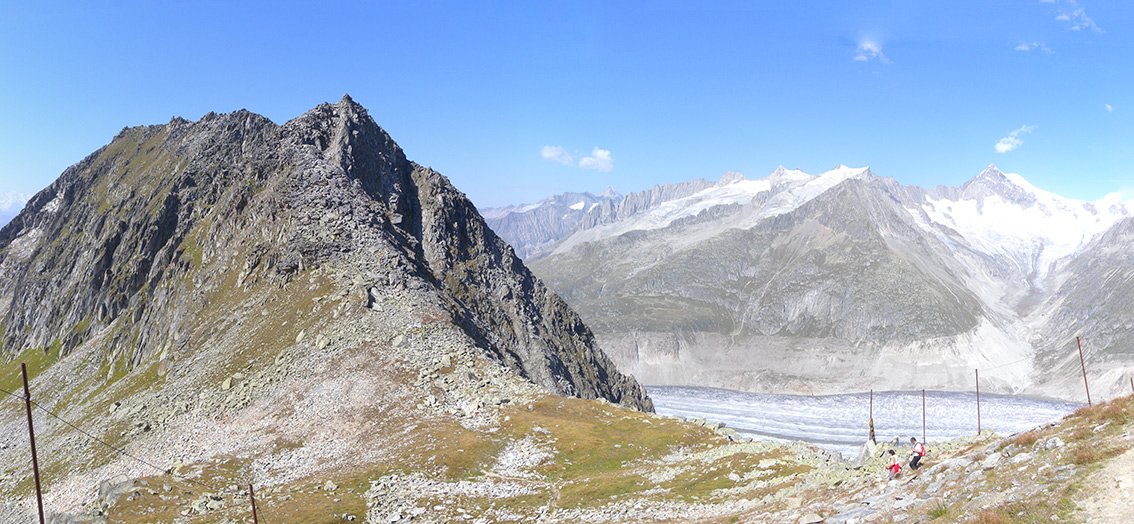 Schöne Kammwanderung mit kurzen versicherten Abschnitten. Man hat fast immer einen perfekten Blick auf den Großen Aletschgletscher. Wer noch etwas Zeit hat, sollte den 2927 m hohen Gipfel des Eggishorns unbedingt „mitnehmen“. Die 100 Hm zusätzlich werden mit einer noch besseren Aussicht auf den Großen Aletschgletscher belohnt.