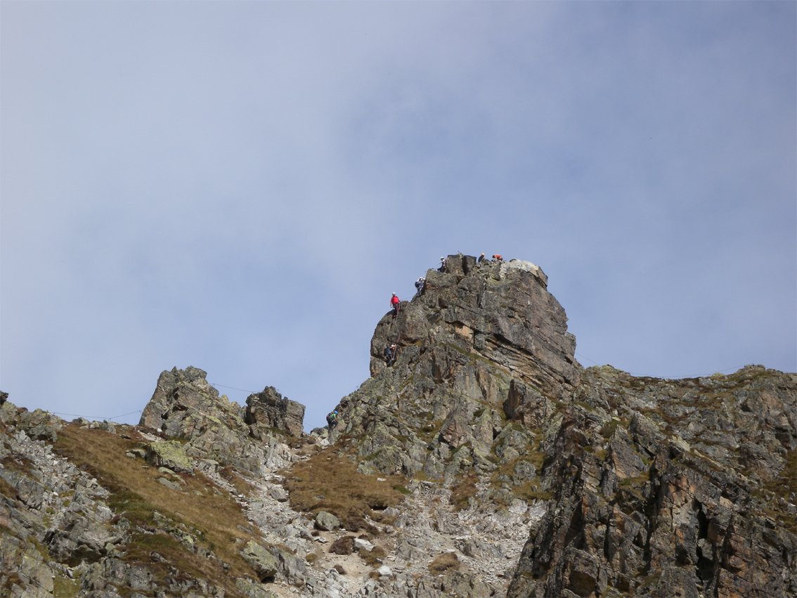 Beide Varianten: Weiter über den sehr schön zu kletternden Grat (Stellen B, meist aber A/B und A) bis zu einer Einsattelung vor der Kristallwand. Dort quert man links in die Steilstufe (B), um dann mit vielen Klammern (B/C) an der steilen Wand hinauf zu klettern. Oben führt ein leichter Grat (A) zum höchsten Punkt (2559 m) der Gargellner Köpfe.