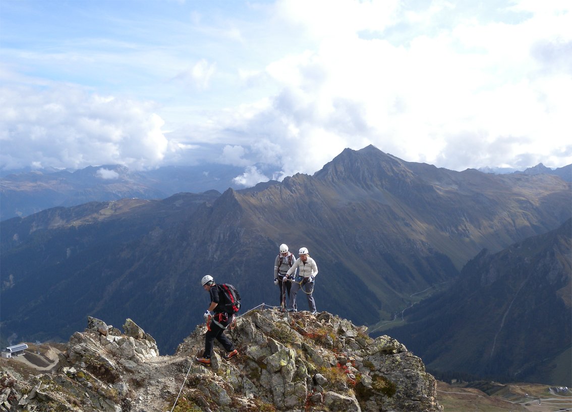 Der Schmugglersteig auf die Gargellner Köpfe bietet alles, was sich leidenschaftliche Klettersteiggeher wünschen: Spannung, eine stimmige Linienführung, atemberaubende Ausblicke, einen kurzen Zustieg und jede Menge Bergabenteuer! Die Normalvariante bietet mit dem Schwierigkeitsstufe C genügend Herausforderungen für diejenigen Klettersteigfans, die gern einigermaßen stressfrei durch die Wand kommen wollen. Zur anspruchsvolleren Variante im Schwierigkeitsgrad C/D gelangt man über zwei 19 bzw. 23 m lange Seilbrücken. Danach fordert die ca. 20 m hohe, leicht überhängende Wand alle Aufmerksamkeit und richtig Muskelkraft. Aber, wer die Schlüsselstelle gemeistert hat, wird auf dem anschließenden Grat mit einem traumhaften Ausblick belohnt. Für alle Gipfelstürmer gilt es nun noch die ca. 12 m hohe senkrechte Kristallwand zu überwinden. Der Gipfel der Gargellner Köpfe belohnt zum krönenden Abschluss mit einem 360 Grad Rundumblick in die Silvretta, das Rätikon und den Arlberg.
