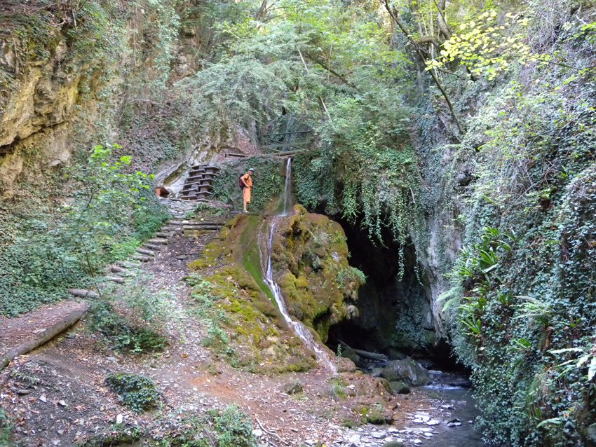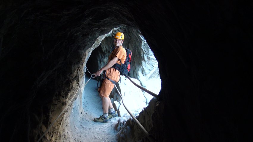 Teil 2, (D): Ausgesetzt aber nicht so schwer (B/C) quert man an der Wand zum Stolleneingang. Im Berg geht man ein Stück auf bzw. neben der rauschenden Wasserleitung, bis man wieder den Stollen verlassen muss. Eine steile Passage (C) leitet das vertikale Finale ein. Eine Rampe (B) führt unter einen überhängenden Fels. Dort muss man kräftig zupacken (D), um bei der nächsten Querung (B) wieder etwas verschnaufen zu können. Dann steil (D), rechts an der Friedenstaube von Hans Henri hinauf und gestuft zum Ausstieg im Wald.