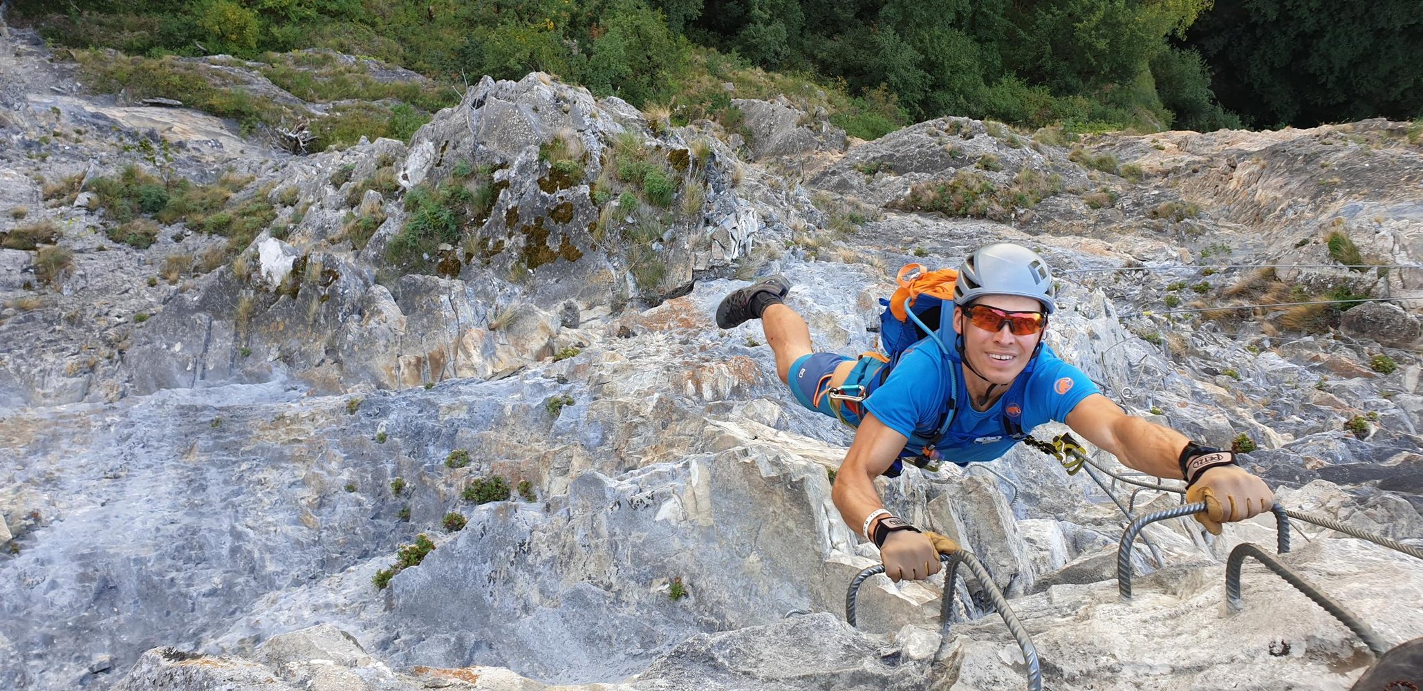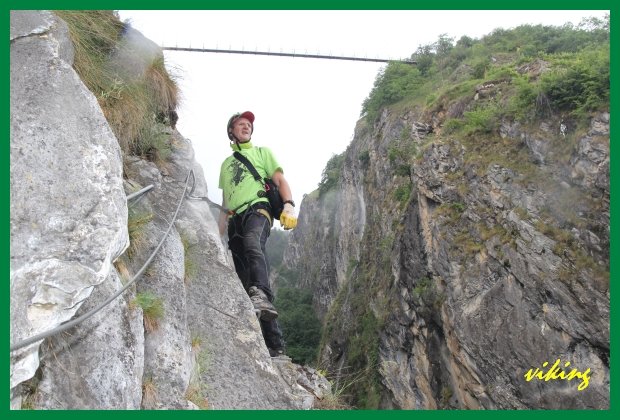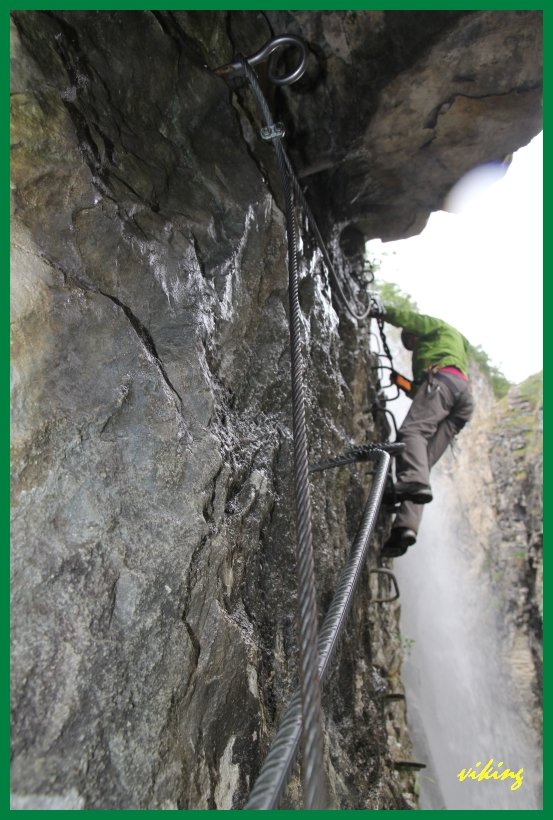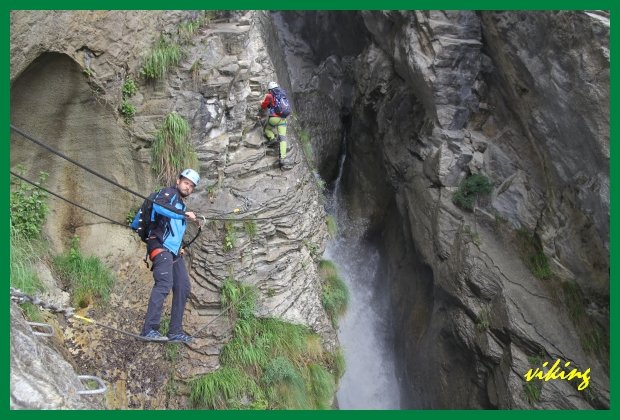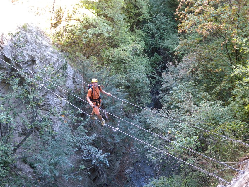Teil 1, (B/C): Auf einem erdigen Band leicht (A) aufwärts zu einer Seilbrücke (B). Nach der Brücke steil hinauf und querend zur nächsten Seilbrücke (B/C). Ein glatter Pfeiler mit Klammern (B/C) führt neben einem Wasserfall hinauf in leichteres Gelände (A/B). Über erdige Felsen erreicht man das Ende von Teil 1 bei einer Wasserleitung.
