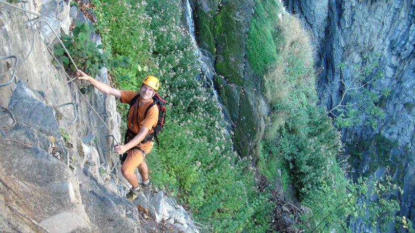 Komplette Klettersteigausrüstung, Helm und evtl. Klettersteighandschuhe; für Anfänger ein Sicherungsseil.