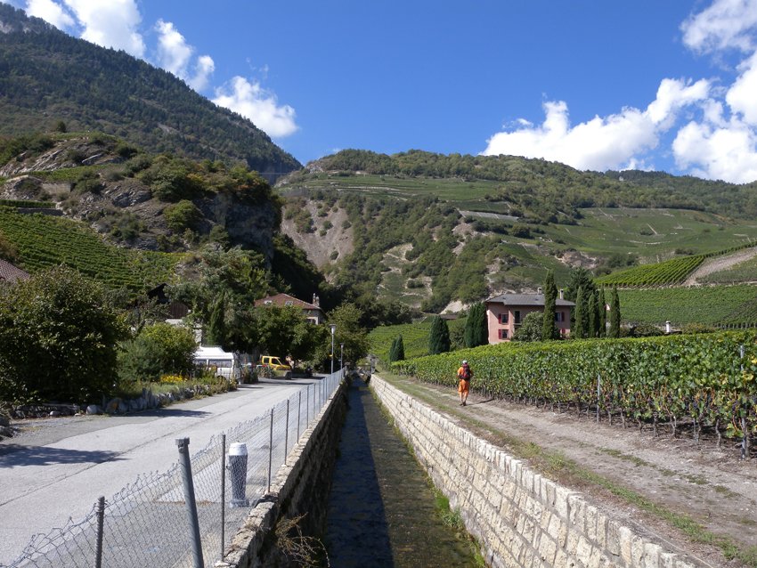 Vom Ausstieg links hinunter zum Schotterweg bei der Hängebrücke und rechts auf markiertem Weg zurück zum Burghügel von Saillon. Vom Ausstieg des ersten Teils links auf markiertem Weg in Richtung Burghügel und zurück in den Ort. Keine weglosen Abzweiger durch die Weinberge machen! Alternativ kann man die Hängebrücke überqueren und von Les Places absteigen bzw. an der Straße das Postauto ins Tal nehmen.