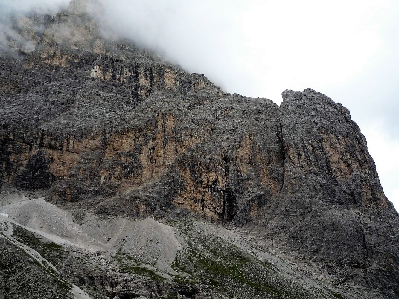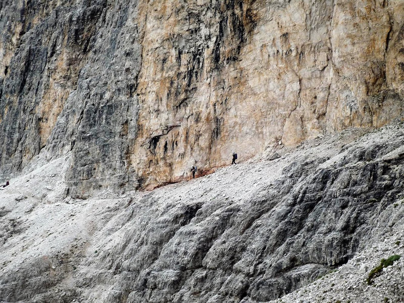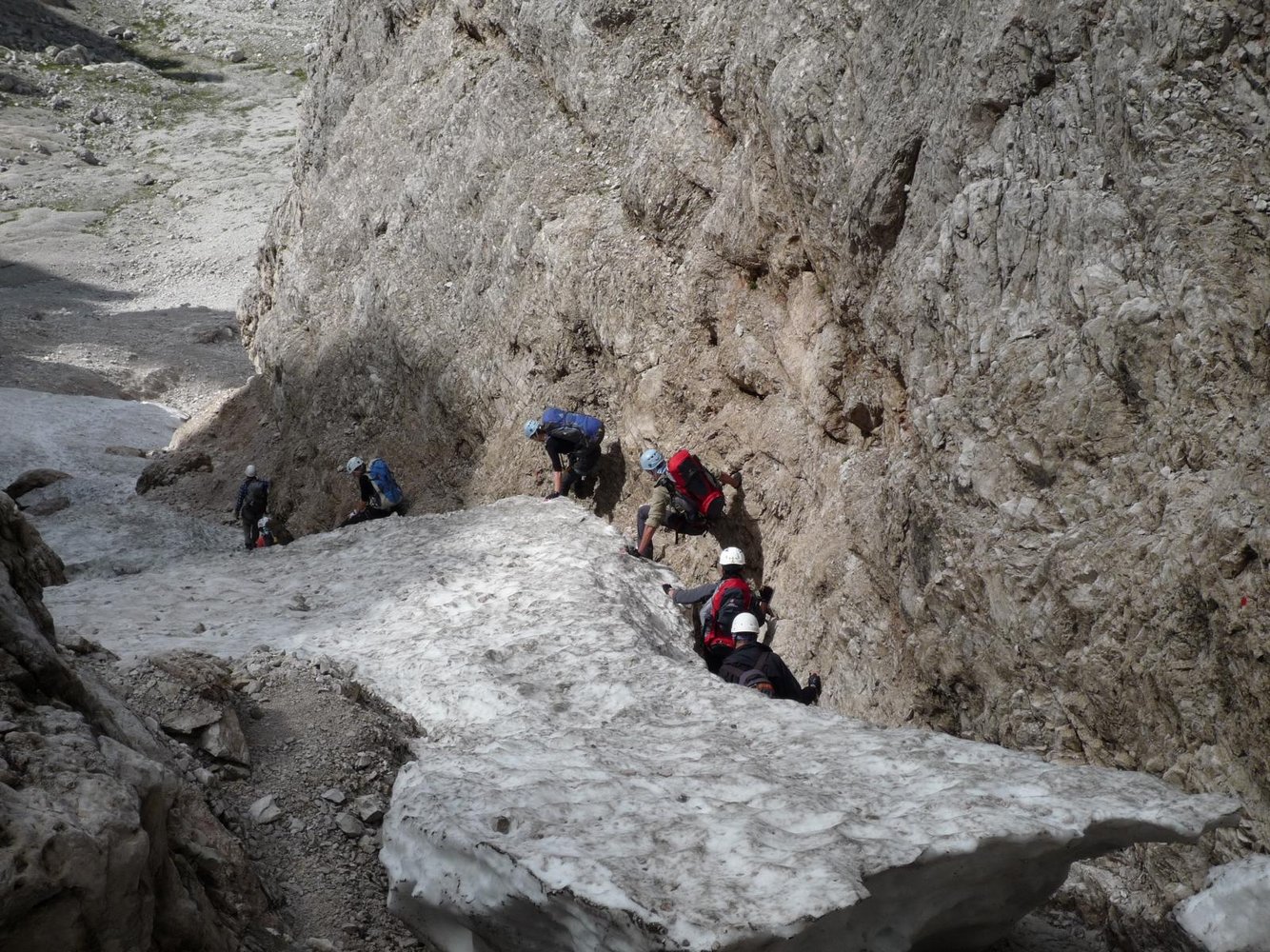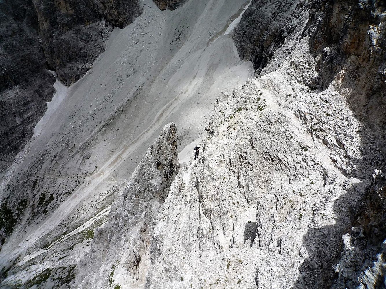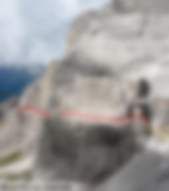 Via ferrata Aldo Roghel: Vom Einstieg (oft noch etwas Restschnee) über Platten (B) und eine mit Trittstiften gesicherte Wand (B) auf das Band unterhalb der Schlucht, die von der Forc. tra le Guglie hinunterzieht. Dann rechts der Schlucht immer schwieriger werdend (zuerst B/C, dann C/D) hinauf zu einem markanten Klemmblock, davor wieder eine glatte Wandstelle (C/D). Anschließend über leichtere Platten (B) hinauf in die Forc. tra le Guglie, 2570 m. Von der Scharte folgt man auf der Westseite einem rinnenähnlichen Band (A) hinab, bis der Weg wieder nach rechts über Plattenwände (A u. A/B) in eine Schlucht führt. Man geht nicht in die Schlucht, sondern steigt links davon über Platten (bis B) weiter ab. Zuletzt muss man in die Schlucht abklettern (1) und trifft auf steile Altschneefelder, die am Schluchtrand überwunden werden. Im Geröllkar führt der Weg anfangs waagrecht zum Talboden. Dort geht der Weg 109 hinunter zum bereits sichtbaren Biv. Battaglione Cadore, 2219 m. Man hält sich jedoch rechts und steigt auf dem Weg 110 zu den Versicherungen der Via ferrata Cengia Gabriella auf. Einstiegskoordinaten: N46.62010 E12.39318. Leicht versichert (A u. A/B) wird die Felsstufe zur Cengia Gabriella überwunden. Auf dem Band geht es über teils kurze exponierte, versicherte (A) Stellen und unter einem Überhang zu einem Wiesenabsatz mit Spalt. Auf der anderen Seite des Spalts über die Felswand (A/B) zu einem Eck und rechts durch eine steile Verschneidung (Schlüsselstelle B/C) zu einer weiteren Felswand, die man links zu einer Rinne überquert (A u. A/B). Durch die Rinne (A) auf ein weiteres großes Band, diesem ca. 600 m auf Gehgelände folgen, bis der Weg links hinunter weist (N 46.61391 E 12.38461). Im Zickzack anfangs A, später B zu einer Rinne zwischen einem vorgelagerten Felsen hinunter. Nicht durch die Rinne (alter steinschlaggefährdeter Abstieg) sondern links bei Versicherungen durch die gestufte Wand (A/B) und ein Band zum Ende des Steiges absteigen. Weiter auf dem Weg 110 zum Rif. Carducci, 2297 m (30 Min.).
