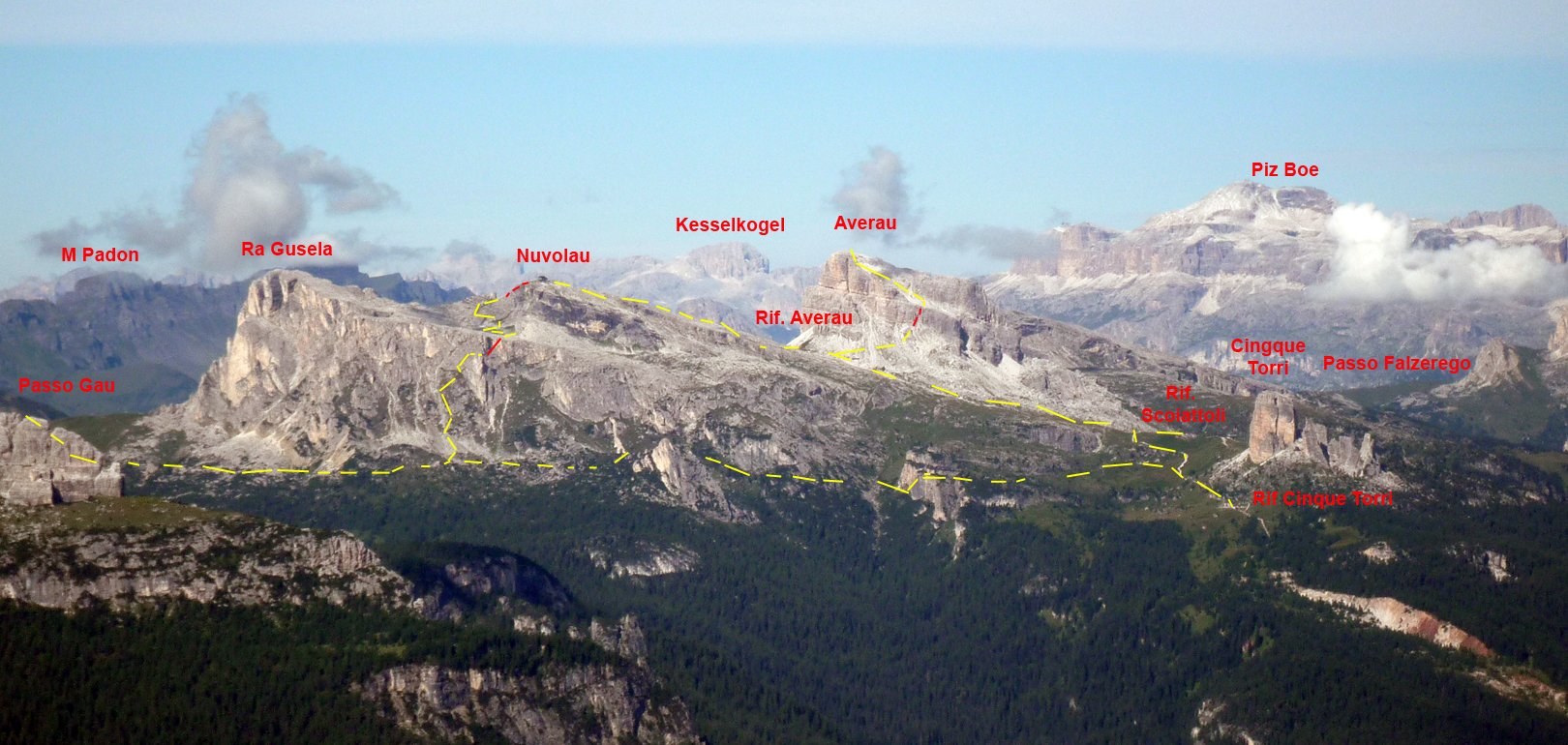 Die Nuvolaugruppe ist zwar nicht besonders hoch, liegt aber perfekt inmitten der großartigen Dolomiten-3000er. Auf ihren Gipfeln eröffnet sich ein Panorama auf Tonfana, Cristallo, Civetta, Marmolada bis hin zur Sella. Die vielen Hütten versprechen einen gemütlichen Klettersteigtag. Die Ferrata Averau ist der leichteste Weg auf den fast unzugänglichen Averau (2649 m) und hat im Mittelteil zwei Varianten. Die schwierigere Var. hat eine spannende Schlüsselstelle, einen steilen Kamin, der - durch Klemmblöcke seitlich verschlossen - einer senkrechten Höhle ähnelt. Obwohl über den Klettersteig abgestiegen werden muss, ist diese Tour auch für Anfänger oder weniger konditionsstarke Kletterer geeignet.
