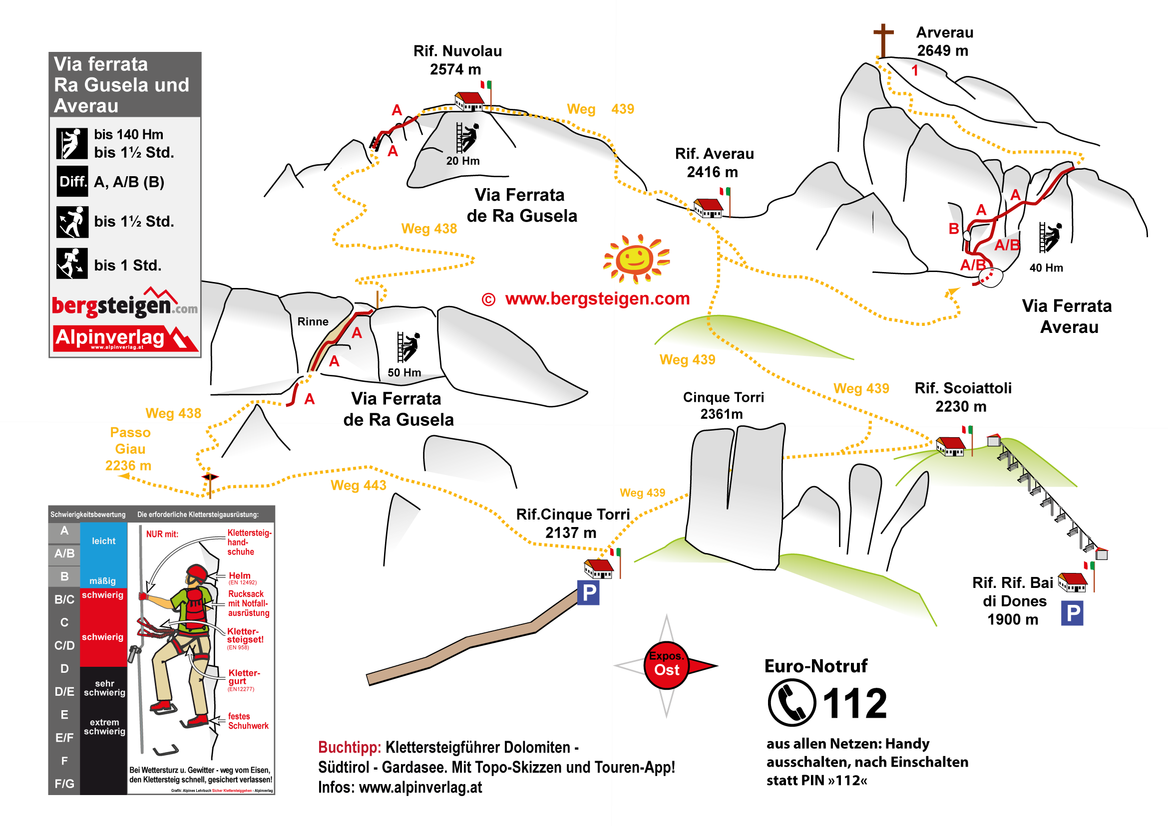 Vom Rif. Cinque Torri auf dem Weg 439 (Fahrstraße) in die Forc. Nuvolau. Wegen der Park- und Zufahrtsproblematik zum Rif. Cinque Torri besser mit dem Sessellift vom Rif. Bai di Dones zum Rif. Scoiattoli und weiter auf dem Weg 439 in die Forc. Nuvolau. Vom Passo Giau: Auf Weg dem 452 in die Forc. Nuvolau. In der Scharte dem Wegweiser folgend in wenigen Minuten zum Einstieg.