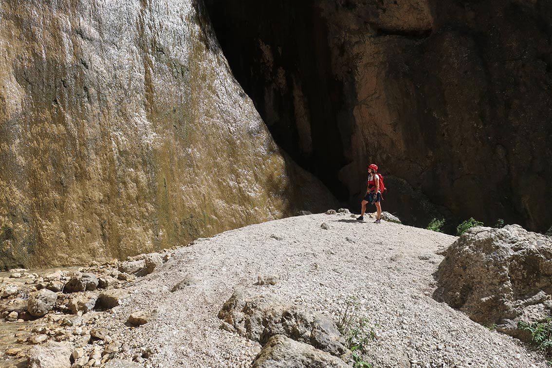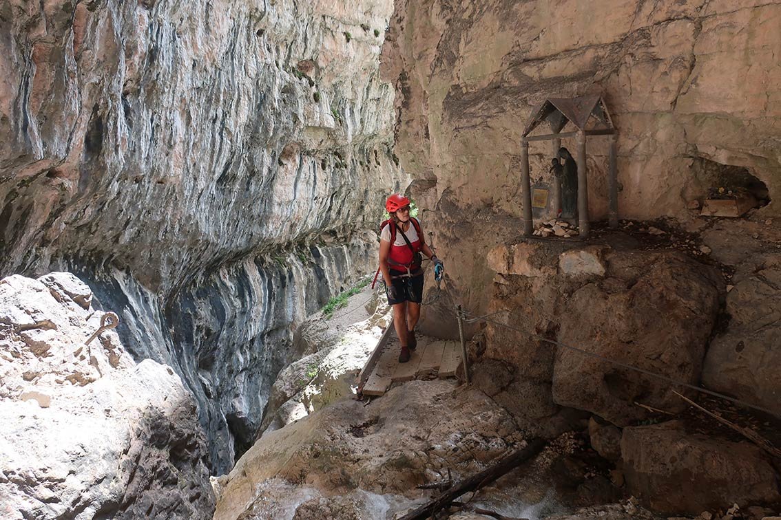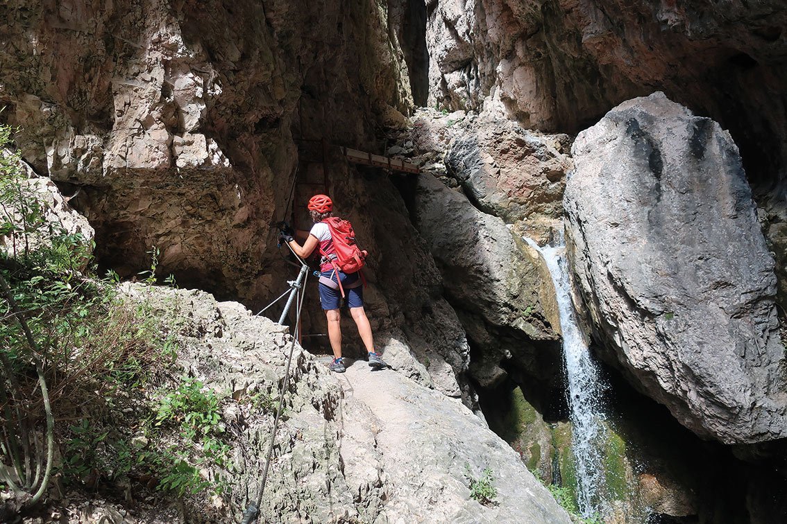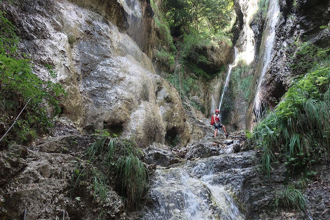 Auf dem Band (A) in die Schlucht, weiter in einen Kessel. Auf der anderen Bachseite führen drei sehr luftige, lange Leitern aus der Schlucht (B und A/B) und nach ein paar Schrofenpassagen (A) erreicht man wieder den Steig. Es folgt eine längere Strecke bergauf, kurze, leichte Kraxelstellen (A) sind zu bewältigen. Bei einem Spalt geht es auf einer kurzen Leiter (A) weiter, über Schrofen (A) erreicht man erneut Gehgelände. Auf einem sehr schmalen und glatt polierten Band (A/B) gelangt man wieder in die Schlucht, wo eine kurze Leiter (A) zum Bach abgeklettert werden muss. Auf der anderen Bachseite eine steile Klammernreihe (B/C, dann B) bis zu einem Band (A) und vorbei an der Madonna, erneut zum Bach. Ab dort eine Gehpassage durch die enge Klamm aufwärts, bis die Schlucht wieder breiter wird. Vor den nächsten Versicherungen kann man rechts zum Wasserfall abzweigen (lohnend). Links gelangt man leicht (A) zu einer Leiter mit einer Plattform am Ende (A/B), nach weiteren kurzen Leiternpassagen und Seilsicherungen (A bzw. A/B) führt der Steig rechts aus der Schlucht, bis zu einem Schotterfahrweg.