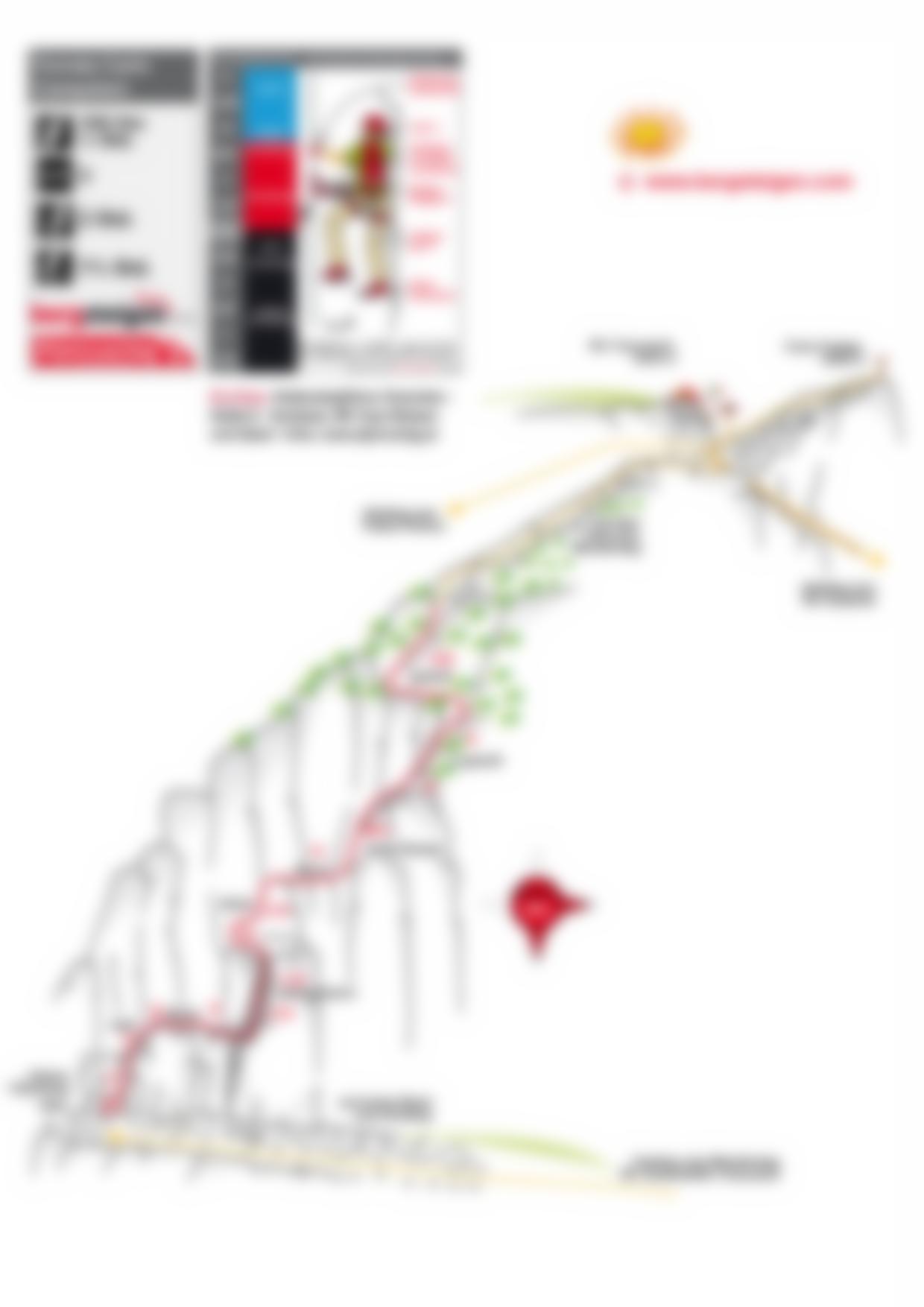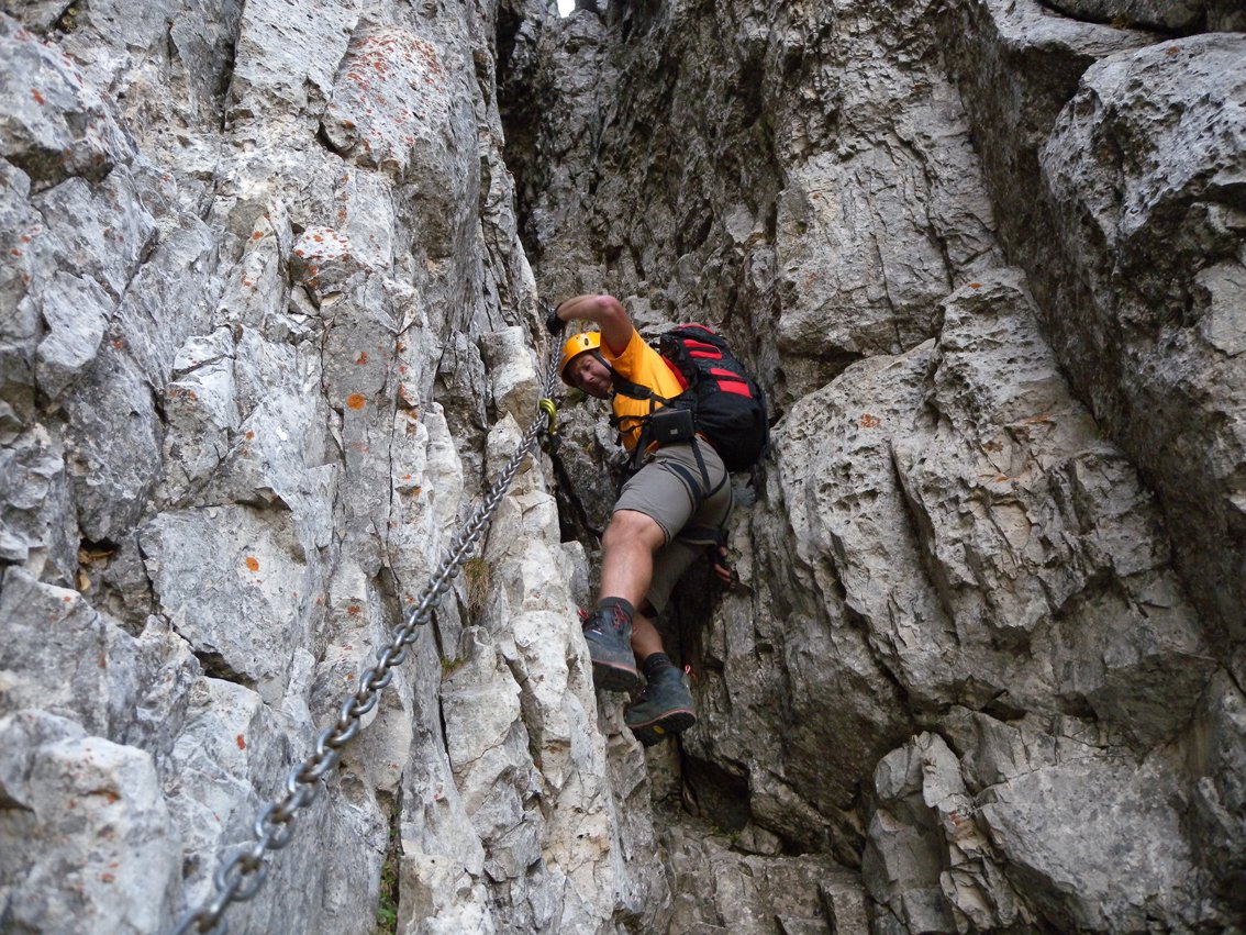 Siehe Topo. Vom Einstieg über einen kleinen Überhang (D), dann kurz steil (C) auf ein Band. Man kommt zu einem steilen Kamin (C/D), danach folgt noch eine steile Stufe (C/D). Nach der Stufe wird es leichter (B/C, dann B) und man erreicht das Ende der Ferrata.