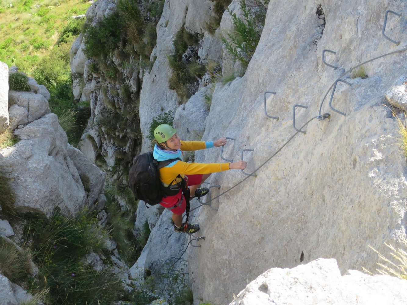 Dem Pfad Falaise Directe hinauf zur Felswand folgen und am Wandfuß nach rechts zum Klettersteig queren.
