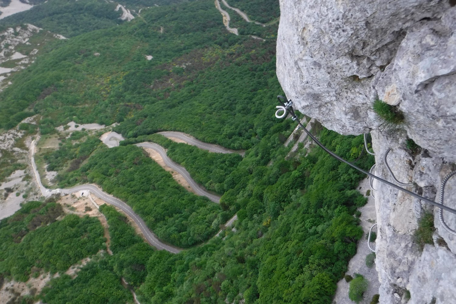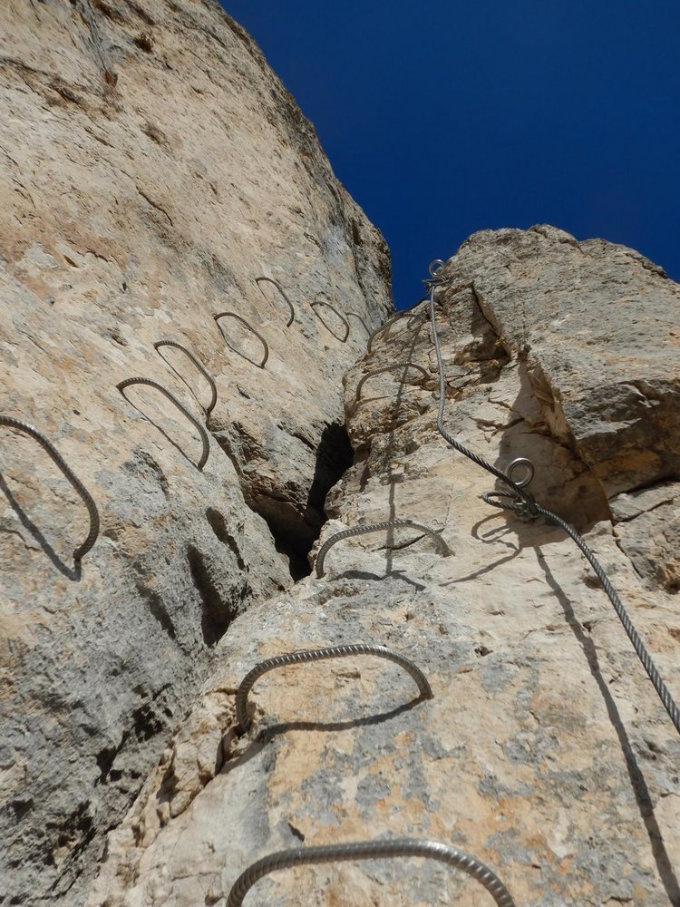 Durch die Einstiegswand auf vielen Bügeln leicht bis `La Chandelle`. Darüber durch eine Verschneidung C/D hoch zu einer Passage hinter einem kleinen Felsturm vorbei. Über einen kurzen Balken. Danach verzweigt sich der KS: Links die leichte Variante und ein Notausstieg. Rechts weiter über einen 2.Balken in eine schräge Querung bis `Les Devers`. Ab hier steil aufwärts auf D zur sehr kraftfordernden, langen `La Traversee des Toits` D/E, die extrem abdrängend ist durch den geringen Abstand zwischen Griffstangen und Tritten. Vorm Ausstieg auf die Gehpassage befindet sich ein Abseilpunkt ACHTUNG 70m! Nach der Vereinigung mit dem leichten Ast folgt die versicherte Gehstrecke `La Grande Vire`. Durch eine schöne Schlusswand auf Bügeln hinauf zur letzten C/D-Stelle im Ausstieg.
