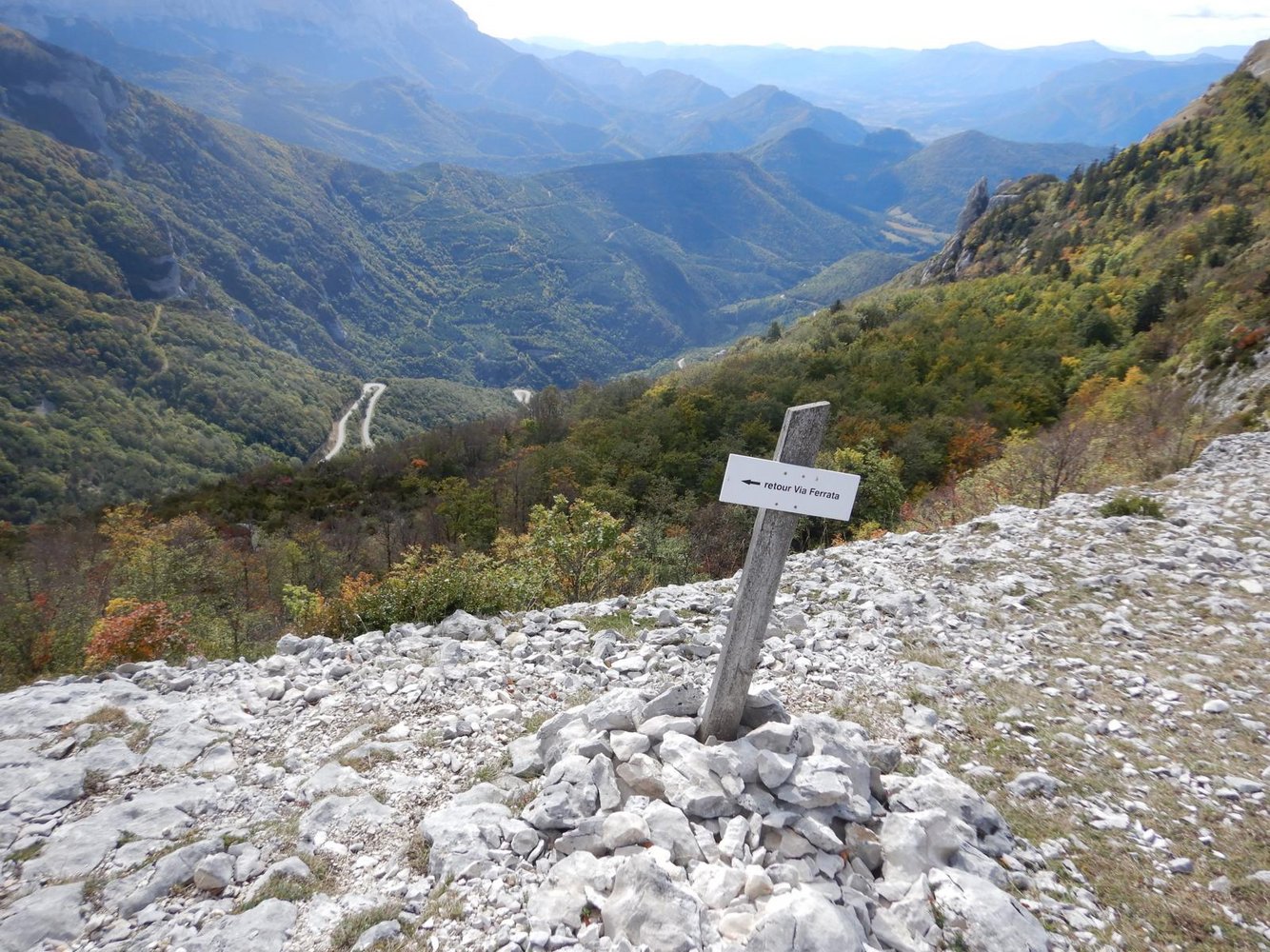 Den Steinmännchen nach links folgen. Dann weiter abwärts auf einem teilweise versicherten Pfad. Dann auf einem Wanderweg im Wald, der zum Pass zurückdreht.