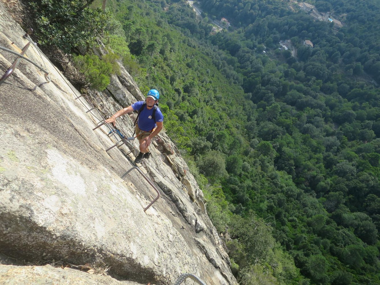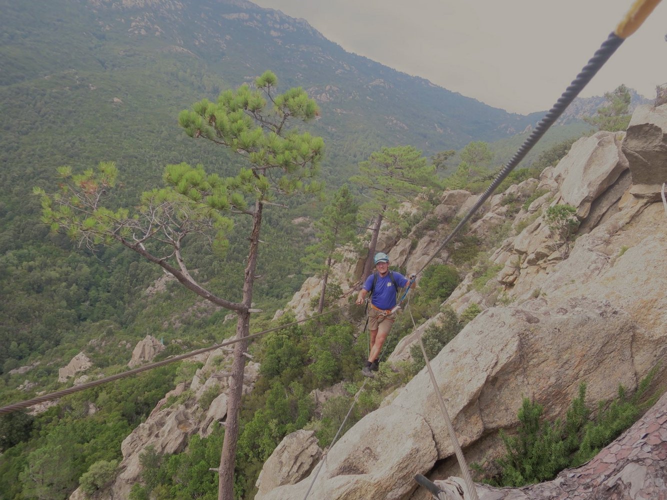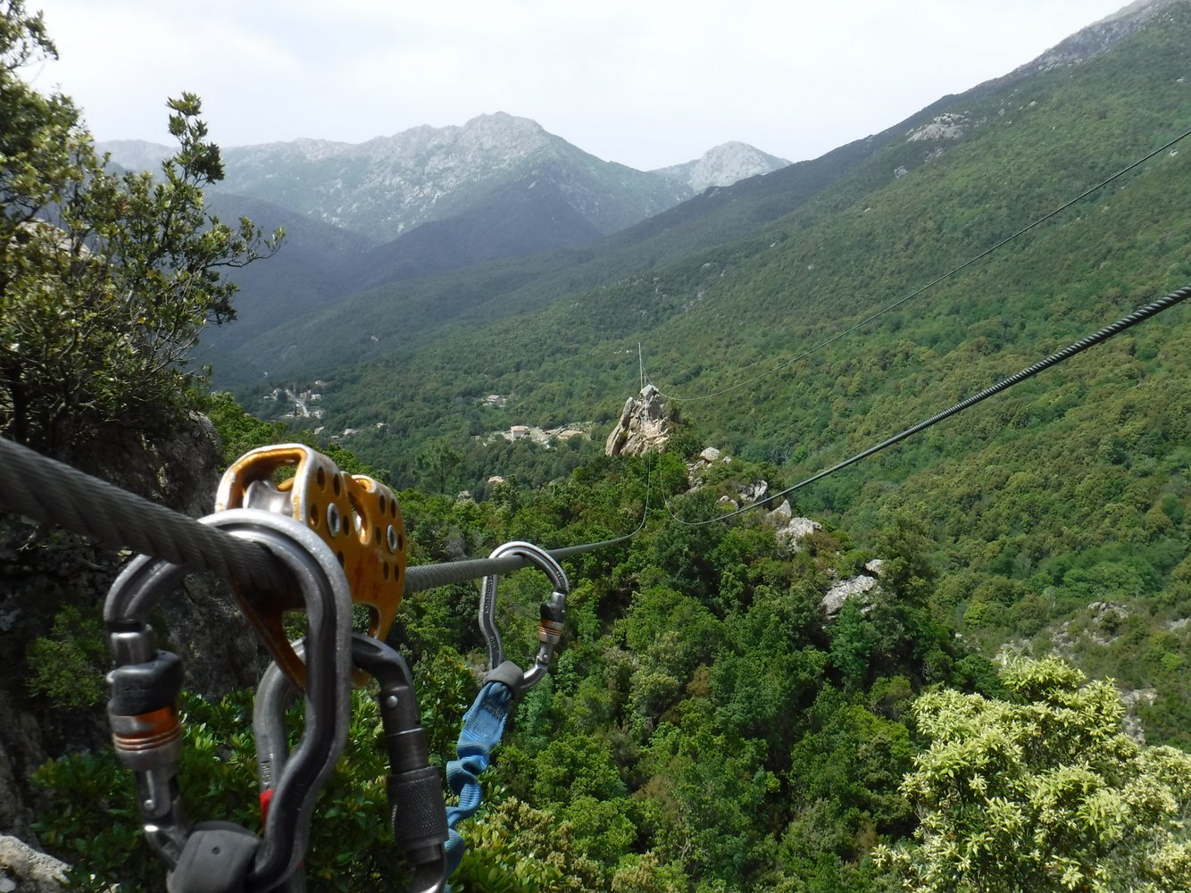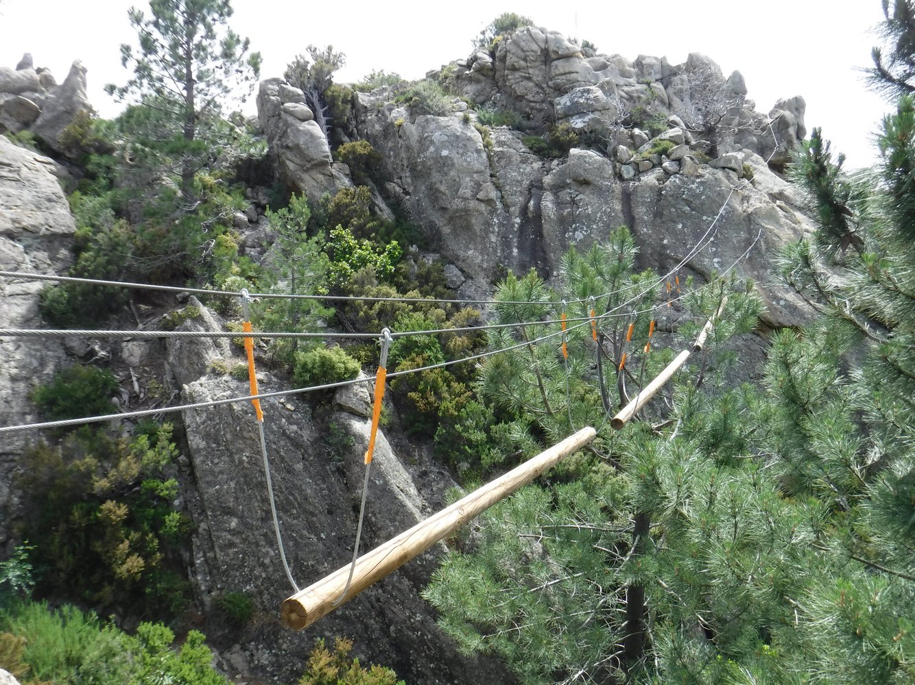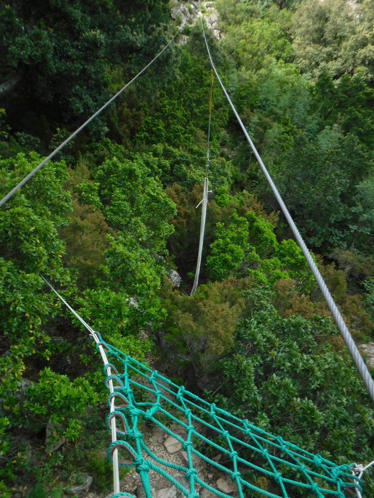 Ein Seil führt hinab zur 50 m langen, recht wackeligen Tibet-Brücke (3-Seil-Brücke mit zusätzlichem Sicherungsseil darüber) ohne seitliche Satbilisierungsseile. Danach folgt eine Hängebrücke mit Trittbrettern. Nach kurzem Gehglände gelangt man zur 100 m langen Tyrolienne “U Pinu”. Rechts befindet sich das Sicherungsseil (“longe”). Auch hier gilt zuvor empfohlenes. Auch hier gibt es vor dem Landepunkt ein Karabiner mit Bremsseil von unten. Es folgt anschließend gleich nächste Seilrutsche, die 80 m lange “U Ditu” zu einem Felszacken, den ein Fahnenmast ziert. Bei dortigem Landepunkt hängt das Bremsseil von oben, geführt von einem dritten Seil. Anschlißend läuft man über eine 3-Seil-Bücke und eine Hängebrücke bergab zum Highlight: der 230 m langen Tyrolienne “U Pitricaghju” hinab ins Tal. Auch hier gibt es rechts vom Rollenseil ein Sicherungsseil (“longe”) und vor dem Landepunkt ein Bremsseil von unten. Bei Landepunkt endet der Klettersteig (65 min.).