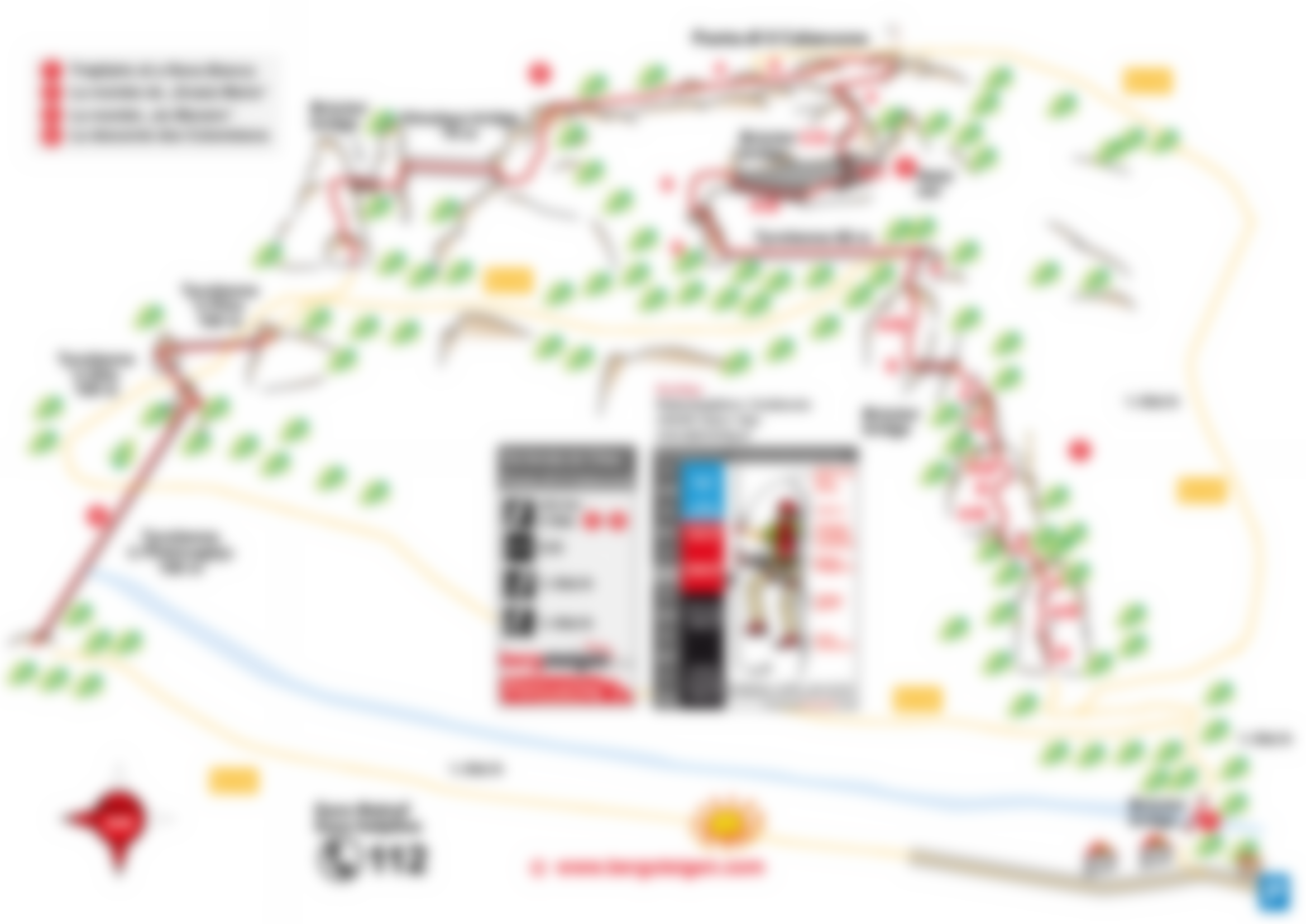 Secteur 3: La montée “du Maire”. Nächste Eisenbügelreihe führt einen Westpfeiler hinauf. Nach rechts hangelt man dann unterhalb eines Felsdaches über eine 2-Seil-Brücke (mit zusätzlichem Sicherungsseil darüber) zu einem hellen Felsüberhang. Auf einem 6 m hohen Drahtnetz klettert man über dieses hinauf und kommt dann zu einem 10 m langen Nepalsteg, wobei für die Füße kein Seil zur Verfügung steht, sondern hängende und schaukelnde, runde Holzbalken. Danach ereicht man über Gehgelände den Felskopf mit einer weißen Fahne (45 min.). Zuvor zweigt nach rechts ein Notausstieg ab. Vor der ersten Tyrolienne gibt es ebenfalls einen Notausstieg.