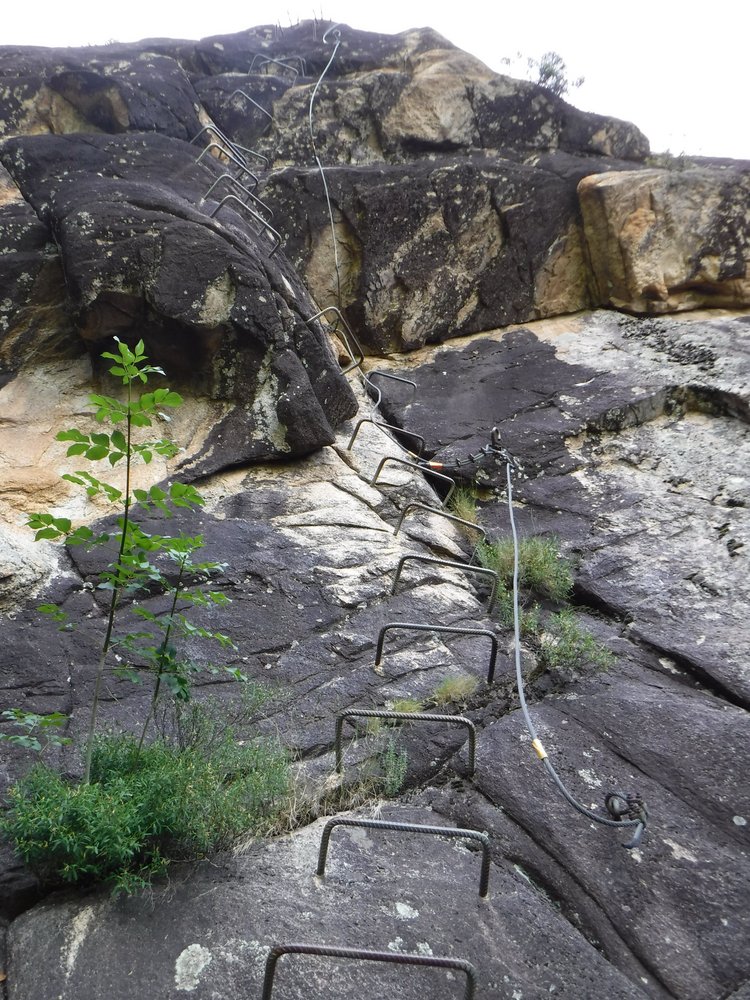 Secteur 2: La montée de “Grazia Maria”: Vom Felsfuß führt eine Eisenbügel-Reihe senkrecht hinauf zu einer 17 m langen 2-Seil-Brücke mit zusätzlichem Sicherungsseil darüber. Nordwärts klettert man weiter entlang der Felswand zur 65 m langen Tyrolienne mit einem Sicherungsseil rechts daneben, an welchem sich rot-schwarzer Hinweis “longe” befindet. Hier ist darauf zu achten, will man sich daran mit einem Karabinerseil sichern, dass dieses wenigstens 1,5 m lang ist, um die Reibung am dortigen Seil zu verringern, welche einen bei der Abfahrt eher ausbremsen würde. Ggfs. verlängert man sein Set-Seil mit einer Bandschlinge und zweitem (selbstsichernden) Karabiner. Am Landepunkt hängt ein dreieckförmiges grünes Fangnetz. Man kommt jedoch gar nicht bis dorthin, denn davor steckt am Rollseil ein Bremsseil mit Karabiner, welches unterm Seil verankert ist. Hier muß man beachten, dass dieses Bremsseil wie ein Katapult zurück wirkt. D.h. man muß sich am Rollseil festhalten, damit man nicht zurückrollt. Dann muß man in der Luft an der Rolle hängend sich um das Bremsseil umkarabinern. Handschuhe sind hier von Vorteil insbesondere dann, wenn die Rolle heiß geworden ist. Am Landepunkt hängt vorsichtshalber schon mal eine rostige Kombi-Zange …