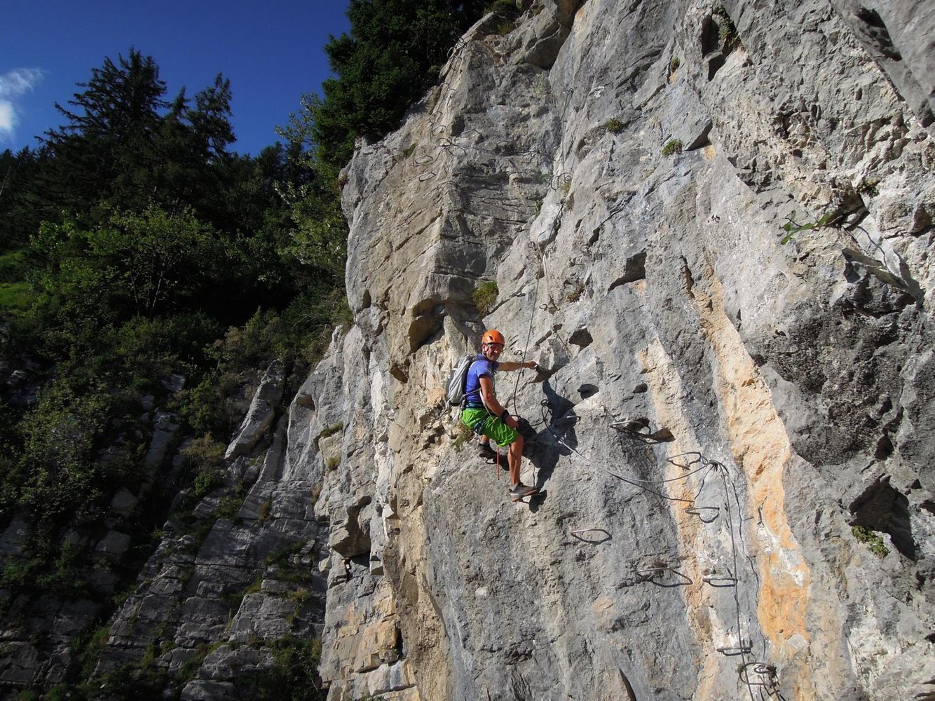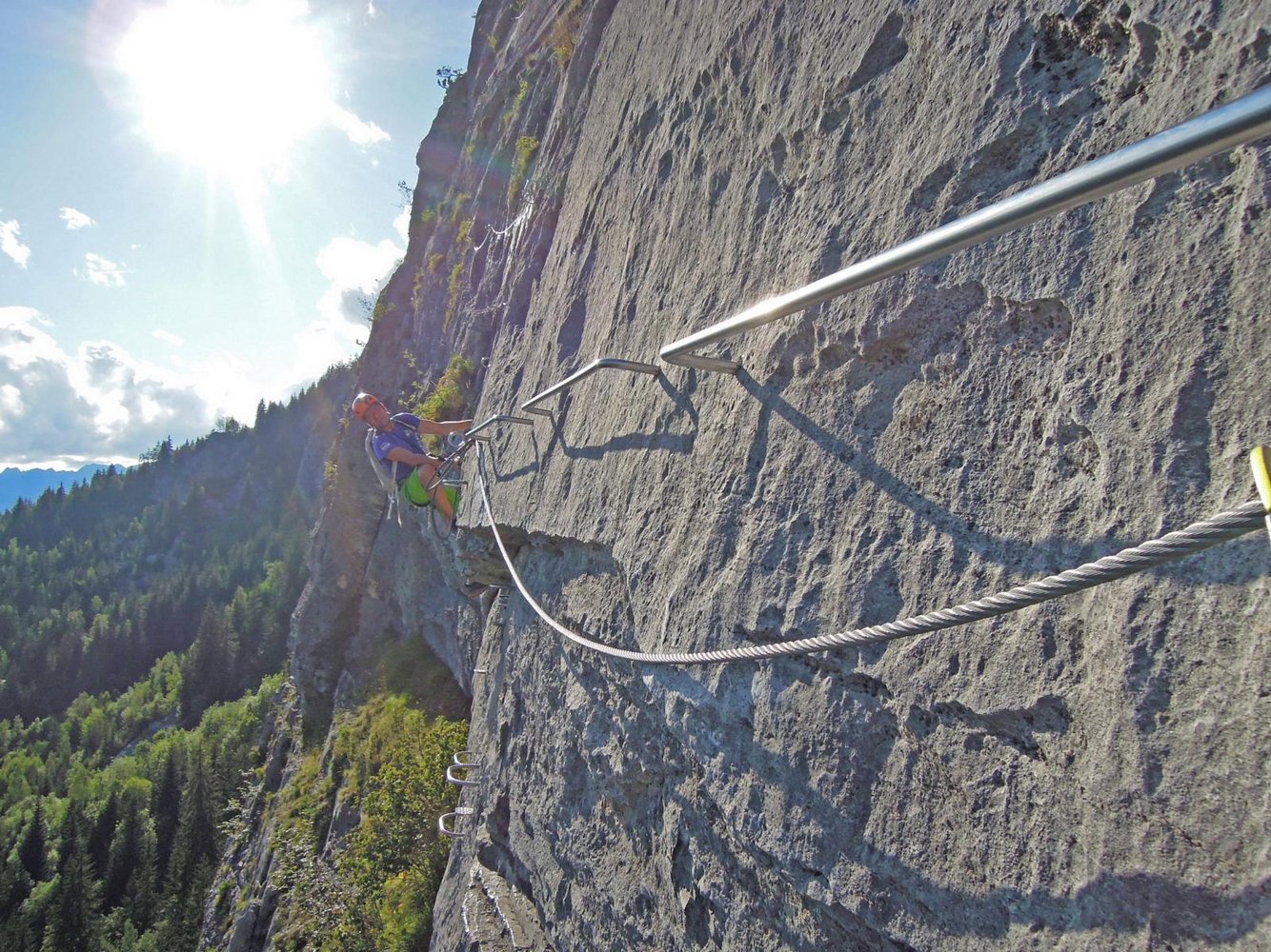 Die Via ferrata de Curalla quert an einer der vorgelagerten Felsklippen unter der Aguille de Varan. Der Steig bietet auf seinen rund 500 Metern Kletterlänge konstante Schwierigkeiten im Bereich B bis C und einen grandiosen Blick auf den Mont Blanc. Da kann man schon mal über den Umstand, dass der Steig schon sehr glatt-geklettert ist, hinwegsehen, zu erhaben blickt der höchste Berg der EU mit seinen riesigen Gletschern auf einen herab. Die Sonne tut es in dieser Südwand auch und zwar nahezu den gesamten Tag, deshalb bitte ausreichend Flüssigkeit in die Tour mitnehmen!