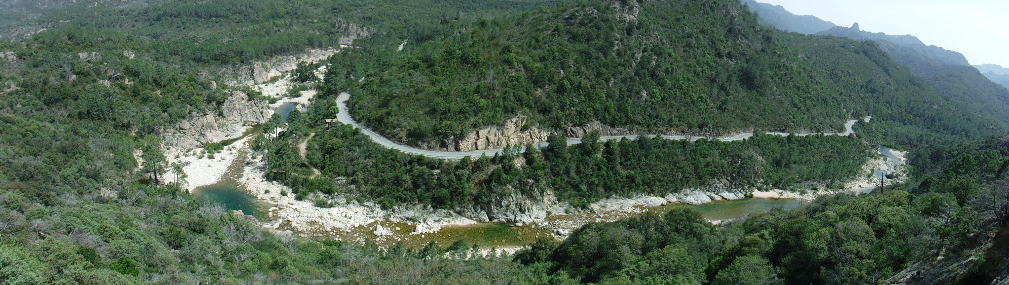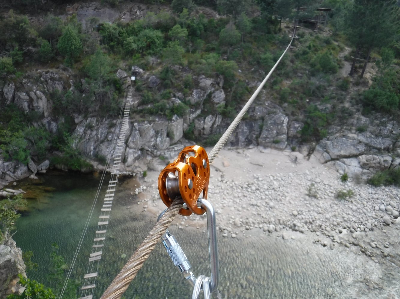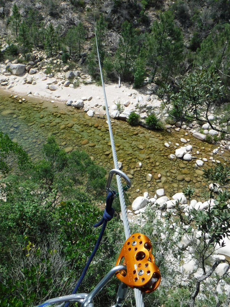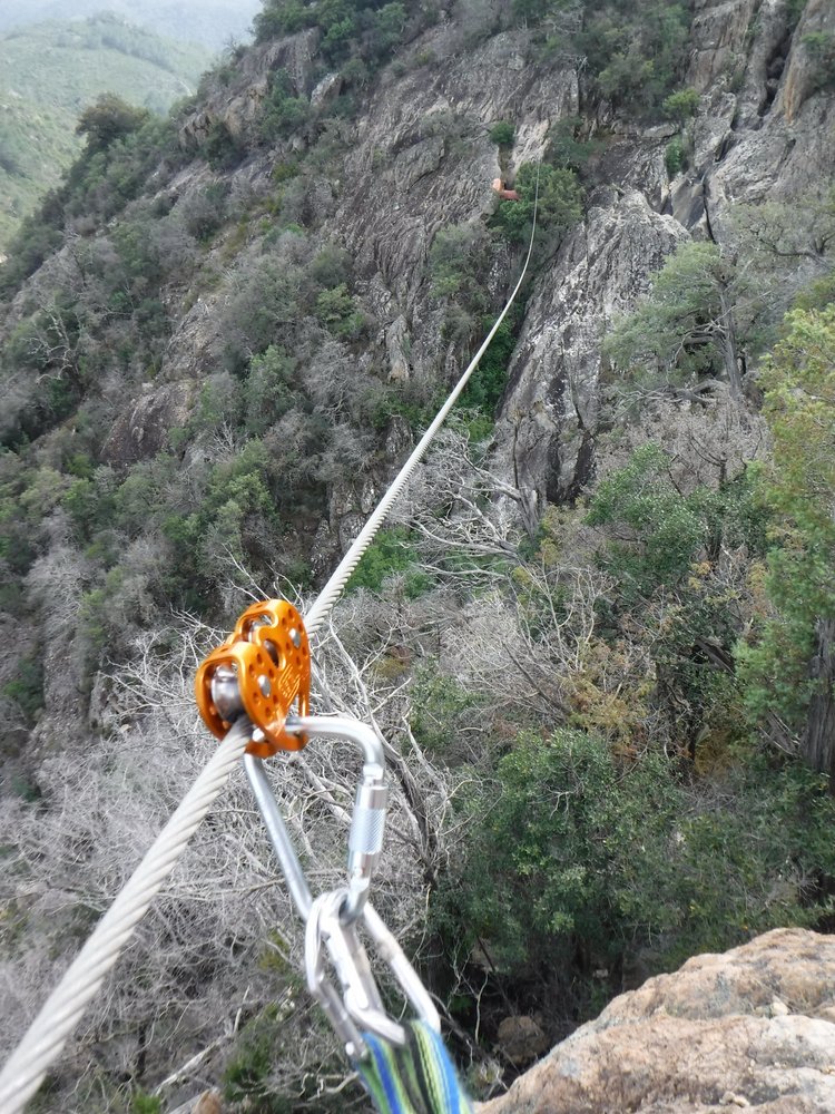 Auf gegenüberliegender Fluss-Seite (70 m) führt nach der 70 m langen Tyrolienne ein Weg entlang des Flusses Richtung Campingplatz im Osten, sodass man dorthin gelangen könnte, ohne die Seilrutsche zu benutzen. Auf einem beschilderten und gelb signalisierten Waldpfad läuft man jedoch nordwärts hinauf in 10 min. zum Felsfuß (150 m). Von dort führt ein Stahlseil nach links hoch zu einem Quergang nach links. Danach gabelt sich die Route. Entweder klettert man senkrecht die Felswand hoch, oder klettert weiter linksquerend, dann absteigend um eine Felsbucht herum, wieder aufwärts und quert dann nach rechts, bis man auf das Sicherungsseil trifft der direkten Variante. Nach rechts zweigt ein Fluchtweg ab. Im weiteren Verlauf überwindet man ein überhängendes Wandstück mit Hilfe eines 7 m hohen Drahtnetzes. Man klettert mit dem Rücken zum Fels. Danach führen Eisenbügel senkrecht hinauf zu 3-Seil-Brücke (Pont Himalayen). Vor dieser gibt es nach rechts einen Notausstieg. Der Klettersteig endet nach rd. 1 Std. auf einem Vorgipfel (290 m). Von hier überblickt man das Gelände und sieht den Campingplatz, nicht jedoch die Seilrutschen über den Tobel des Ruisseau de Buccarona im östlichen Teil des Berges, zu denen man im Abstieg kommt. Vom Vorgipfel steigt man kurz auf nördlicher Seite hinab in einen kleinen Waldsattel, wo sich der Pfad teilt. Nach rechts weist ein Holzschild „Retour“. Man wandert seilfrei über Gehgelände bis zu einer 2-Seil-Brücke (Pont de Singe), auf der man den Ruisseau de Buccarona überquert. Dann führt der Pfad an linker Bachseite entlang hinunter durch Gesträuch zur 50 m langen Tyrolienne. Auf dieser rutscht man über eine Schlucht zu einer Felswand. Nach kurzem Quergang dort nach rechts zum Startpunkt der 110 m langen Tyrolienne kommt man wieder zurück. Über einen Pfad (Gehgelände) kann man die beiden Seilrutschen umgehen. Beide Seile sind so aufgehängt, so dass man nicht all zu viel Fahrt aufnimmt und bereits einige Meter vor der Landestation zum Stehen kommt. Eine kugelgelagerte High-Speed-Seilrolle ist hier von Vorteil. Über den südöstlichen Bergrücken läuft man nun hinunter zu einer Weggabelung. Geradeaus kommt man zur kurzen (petite) Tyrolienne (50 m) über den Fluss Solenzara und läuft danach zum Überstand an der Straße hinauf. Oder man läuft nach rechts zur großen (grande) Seilrutsche (230 m) über die Wasserbecken des Flusses zur gegenüberliegenden Felswand hin. Von dort läuft man über eine Hängebrücke zurück Richtung Straße. Alternativ fährt man mit der 5. Tyrolienne rechts von der Hängebrücke dorthin. Am Ende der Hängebrücke gibt es noch eine kurze Tyrolienne zu einem Baum hin und dann direkt zur Holztreppe vom Unterstand (1 Std.).