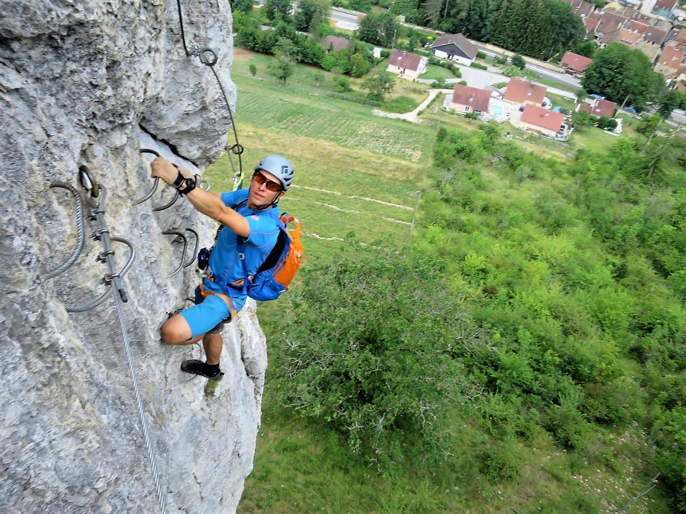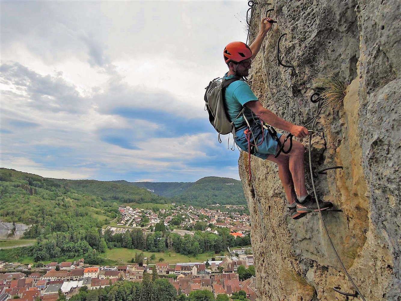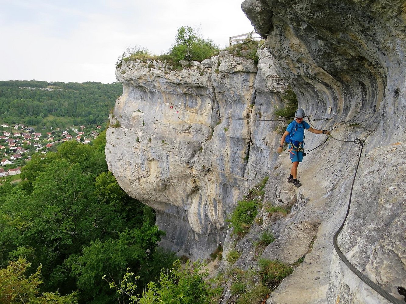 Über dem lieblichen Städtchen Ornans erhebt sich ein Hügel mit einer langezogenen, etwa 40 Meter hohen Felsklippe, dem Rocher du Mont. Entlang dieser Klippe quert auf 380 Metern immer knapp unter der oberen Felskante des Rocher du Mont. Ein gemütlicher auch für Anfänger geeigneter Klettersteig, von dem man immer einen schönen Blick auf die Dächer von Ornans und den Fluss La Loue hat.