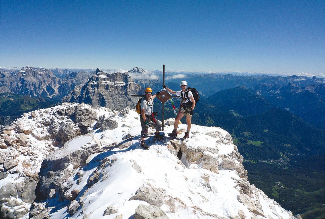 Ganz großes Ferrata-Abenteuer auf einen der höchsten Dolomitengipfel! Die Via ferrata degli Alleghesi bietet einen unvergesslichen Mix aus vertikalen Stahlseilpassagen und alpinem Flair, der den Begeher noch beim Abstieg über den Normalweg begeistert. Der logische Routenverlauf führt anfangs direkt über den etwa 400 m hohen Ostsporn der Punta Civetta. Weiter oben ist das Felsgelände zerklüfteter und mit zahlreichen Türmen gespickt, ehe über den Nordgrat der Gipfel erreicht wird. Die Route ergibt, dank der verwegenen Trassierung und trotz der Länge, ein abwechslungsreiches, spannendes Klettersteig-erlebnis. Dass die grandiose Aussicht von diesem mächtigen Dreitausender das Tüpfelchen auf dem „I“ ist, braucht wohl nicht extra erwähnt werden.