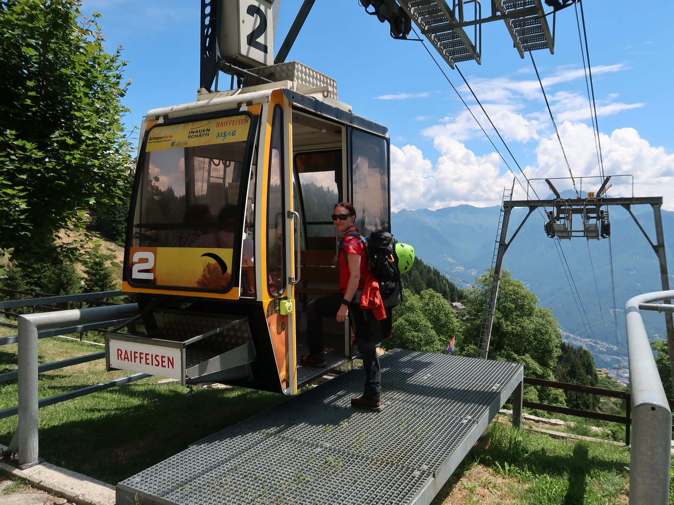 A2 bis Bellinzona und durch die Stadt zur Talstation der Seilbahn Monte Carasso – Mornera. Mit der Seilbahn nach Mornera.