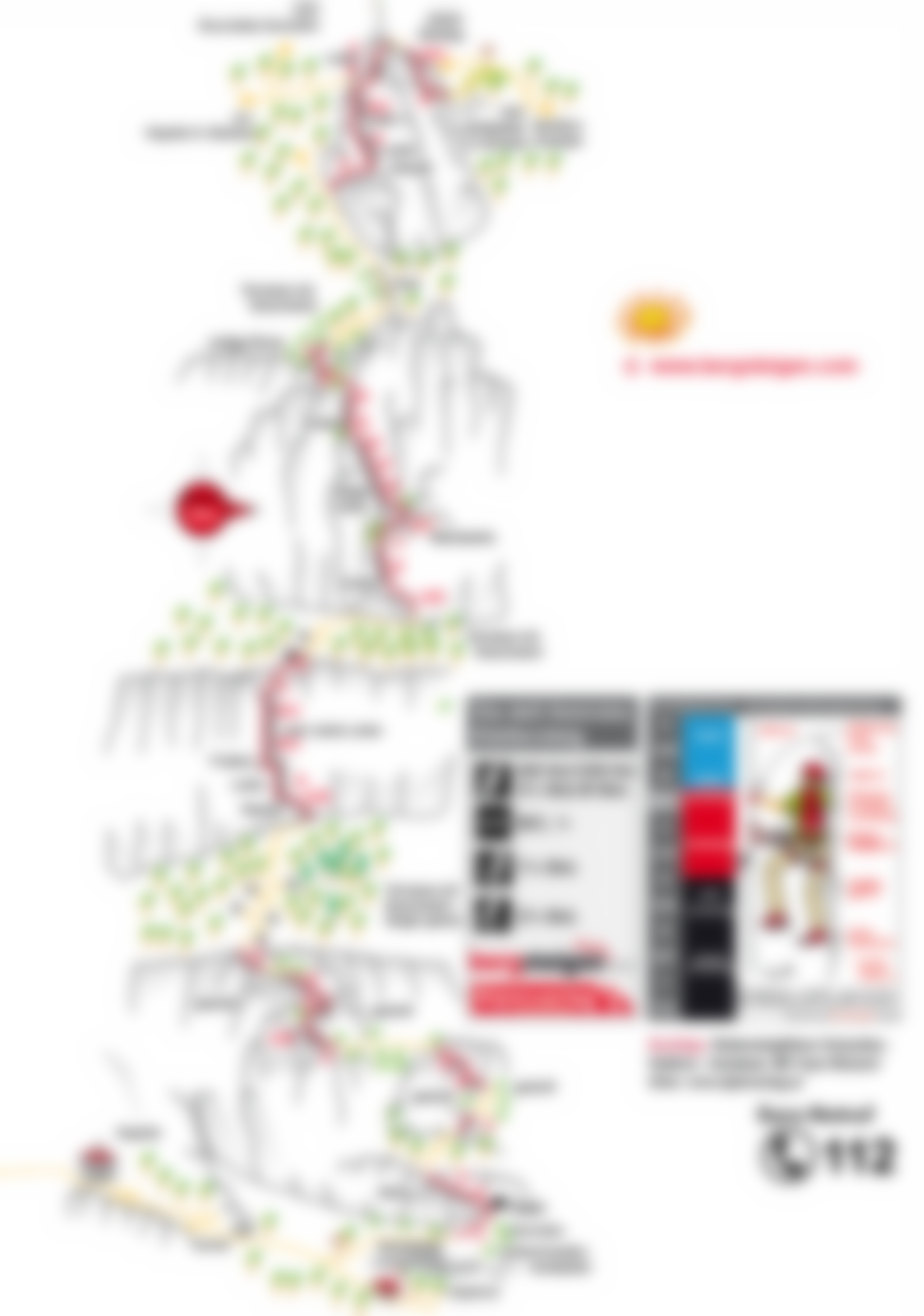 Siehe Topo. Vom Anseilplatz über eine kurze Schrofenpassage zum eigentlichen Einstieg bei einer Tafel. Dort quert man leicht (A) auf einem Band nach links und gelangt nach einer Gehpassage zur nächsten Steilstufe. Nach einer kurzen Blockpassage (A) folgt man einem Band (B) und erreicht dann gehend wieder die Stahlseile. Sanft ansteigend (A), dann über eine Steilstufe (B) und über Bänder (A) gelangt man zum Ende des ersten Felsaufschwunges. Zu Fuß durch Wald und Buschwerk zur nächsten Stufe. Dort über eine kurze, dann länger, lange Leiter (unten A/B, dann B und B/C) auf das nächste Flachstück. Leicht rechtshaltend (längeres Gehstück) erreicht man Blockgelände (A), welches zur nächsten Leiter (B) führt. Danach kommt eine kurze steile Wandstelle (B/C), es folgt eine sehr lange, luftige Leiternreihe (B - das Highlight!), die oben in eine erdige Rinne (A) führt. Gehend - kurz im Bereich einer Gratpassage - erreicht man das letzte Steilstück unter dem Gipfel (man kann dieses auch auslassen und gerade durch den Wald zu Fuß weiter aufsteigen). Über eine Rampe (A) gelangt man an die Kante, auf einer Leiternreihe (B u. B/C) steigt man höher und erreicht schlussendlich genau den Gipfel der Cima SAT mit der Fahnenstange.