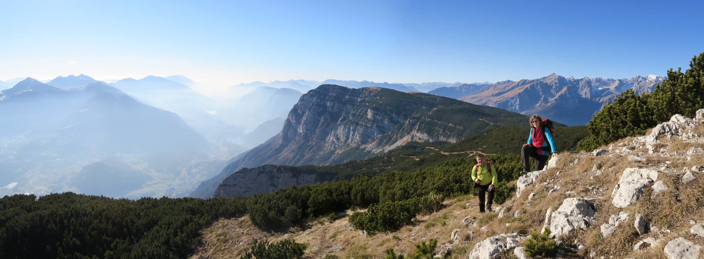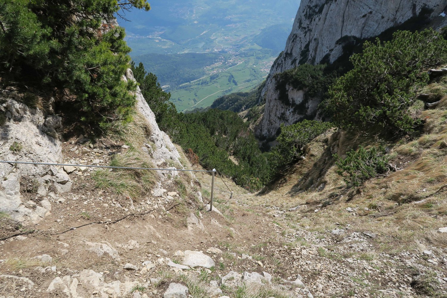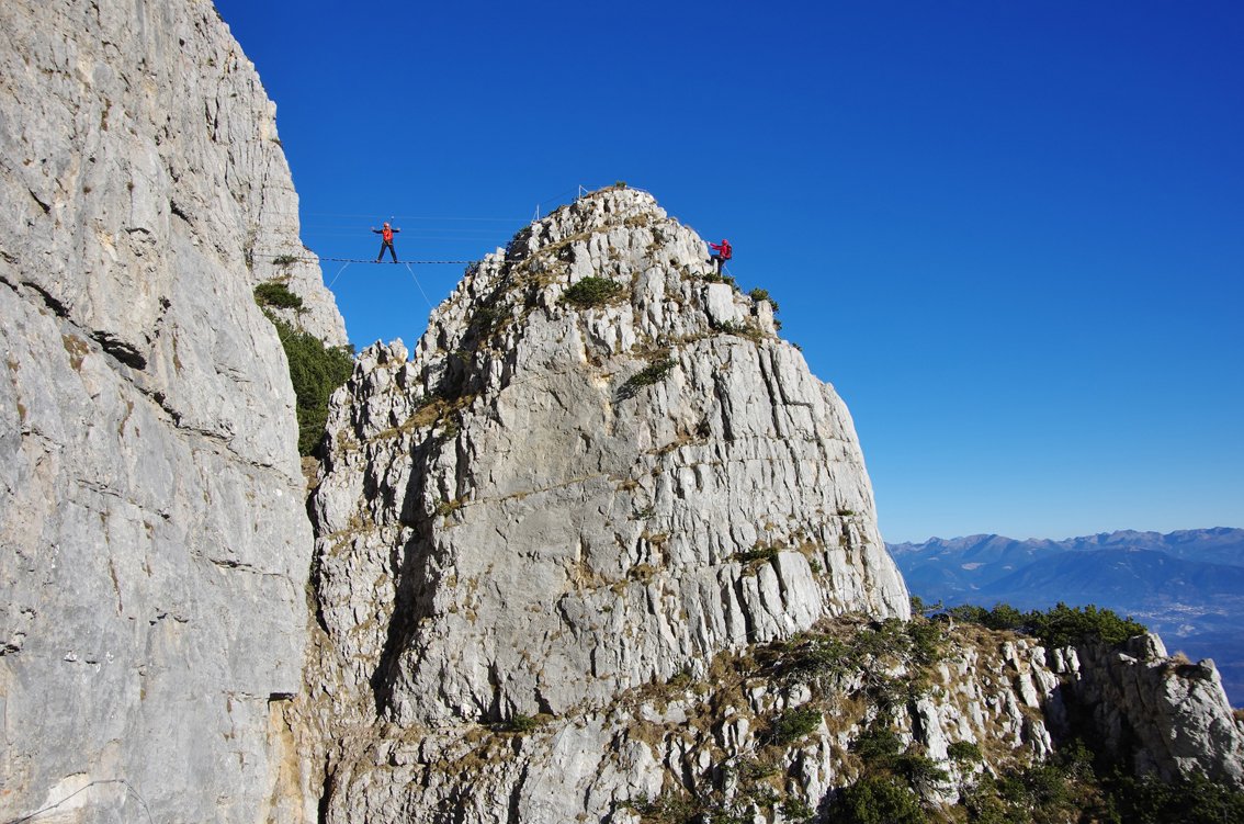 Gewaltig ausgesetzt quert man lange an der mächtigen Felswand der La Paganella - selten hat man bei einem Klettersteig solch tiefe Abgründe unter den Sohlen! Die Tour an sich ist mittelschwer, wenn jemand aber mit sehr ausgesetzten Passagen psychisch belastet ist, wird er sich vermutlich deutlich fester als nötig an das Stahlseil krallen. Eine schöne Klettersteigtour, die sowohl den Gardasee, die Brenta und die Stadt Trento als Landschaftskulisse zu bieten hat - ein schöner, langer und moderner Sportklettersteig nahe der Bergstation mit ausgesetzter Querungen und gewaltigem Tiefblick.