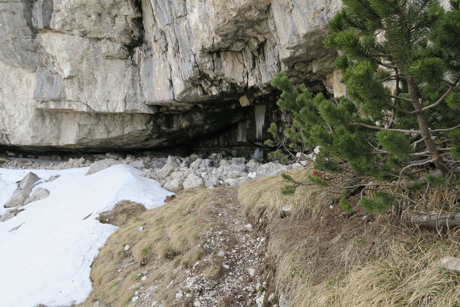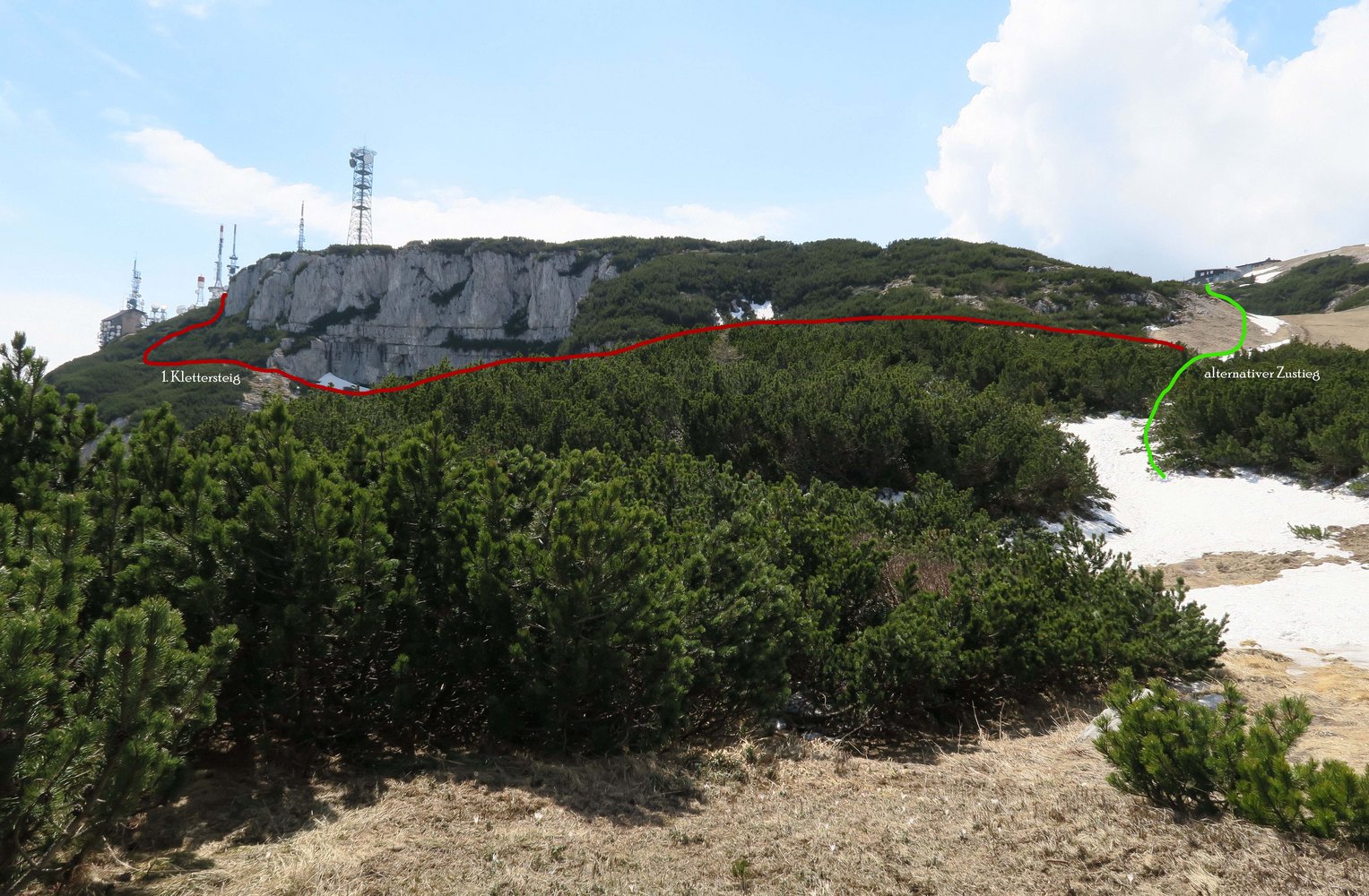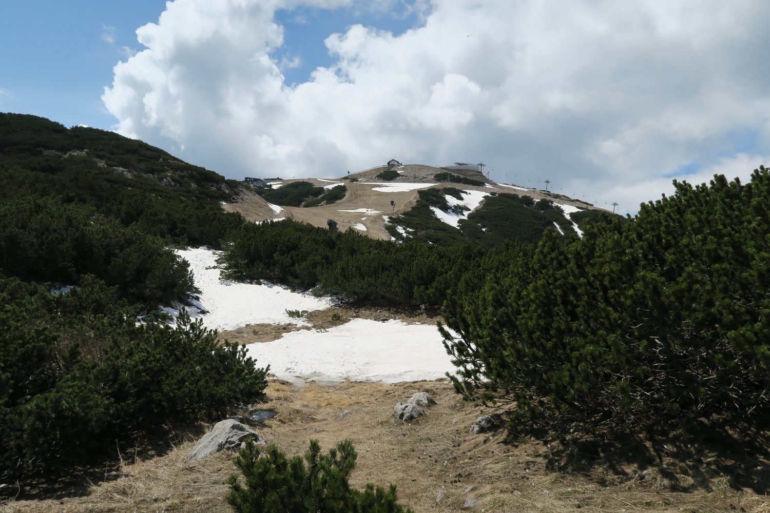Vom Ausstieg entlang der Kante (Weg in den Latschen ausgeschnitten) zurück zur Scharte und von dort auf der Piste hinauf zur Bergstation.