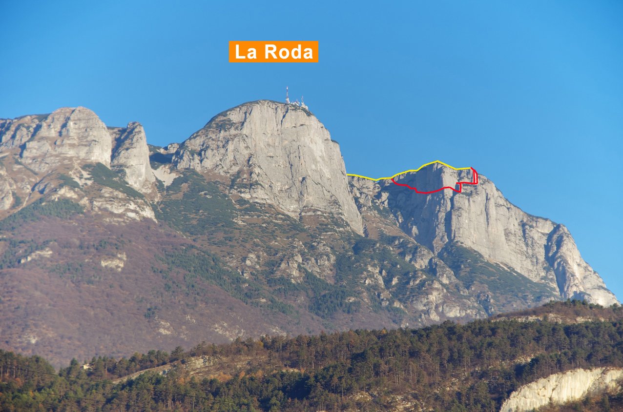 Als Alternative zur Seilbahnfahrt bietet sich der Aufstieg von Terlago an. Man folgt dem Weg 606 bis kurz vor den Paso San Antonio und zweigt dann rechts zum La Roda Gipfel ab (gesamt kommt der Tag dann auf 1600 Hm). Der Fußaufstieg von Andalo durch das Skigebiet ist etwas kürzer - ca. 1000 Hm/2- 2,5 Std. Man kann auch mit dem MTB bis zum La Roda Gipfel hinauf fahren. Achtung: Bei Nässe ist vor allem der erste Teil sehr unangenehm. Im Frühjahr sollte man die Schneelage in der Wand (am besten vom La Roda Gipfel aus) checken.
