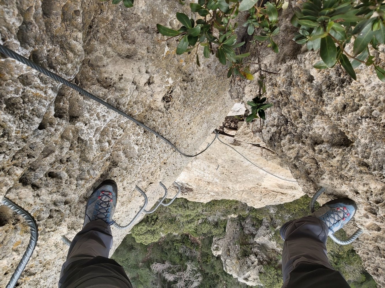 Es folgt eine längere Zweiseilbrücke und wieder ein gesichertes Band bevor sich das große Finale vor uns auftut: Drei Zweiseilbrücken und die Nadel, die sich als Fotopunkt direkt aufdrängt. Wer mag, kann hier abseilen oder einfach das Stück an der Nadel wieder absteigen. Nach der letzten Seilbrücke gehen wir ein kurzes Stück, um dann -wieder gesichert- das Ende des Klettersteigs in Form einer Abseilstelle (ca. 10m) zu erreichen. Da wir kein Seil dabei haben, gehen wir ein Stück zurück. Auf Höhe des Holzbalkens führt uns eine enge Felsspalte zum alternativen Ausstieg.
