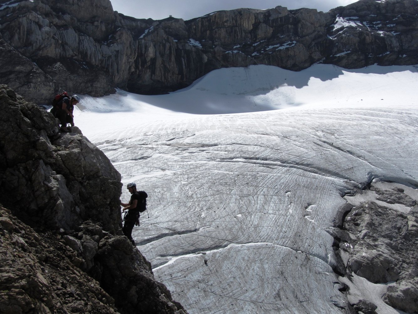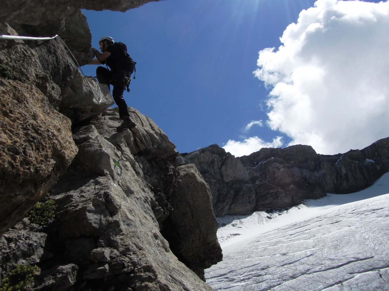 Pickel und Steigeisen sind auf dieser Ferratatour wichtiger als das Klettersteigset. Der Gletscherrückgang ist auch am Glacier de Prapio nicht spurlos vorbeigegangen. Die Randkluft unter dem Col de Prapio ist zu einem gefährlichen Bollwerk geworden. Aufgrund dieser Not wurde der Steig verlegt und es entstand eine echte Ferrata, die man ohne Gletscherausrüstung machen kann. Meist wird die Tour mit einer Besteigung des Le Dôme kombiniert und man steht dann auf einem 3000er.