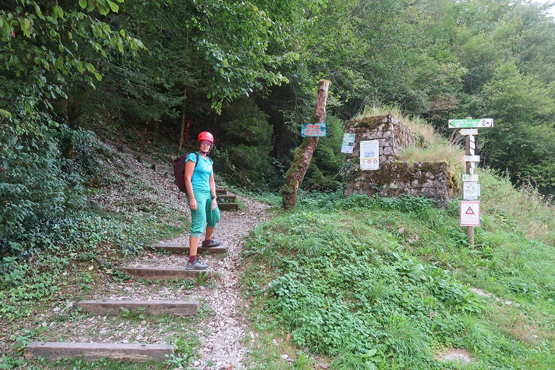 Vom Parkplatz dem Weg hinauf zu den Felsen folgen und der Wand etwas entlang bis zum Einstieg (Tafel).